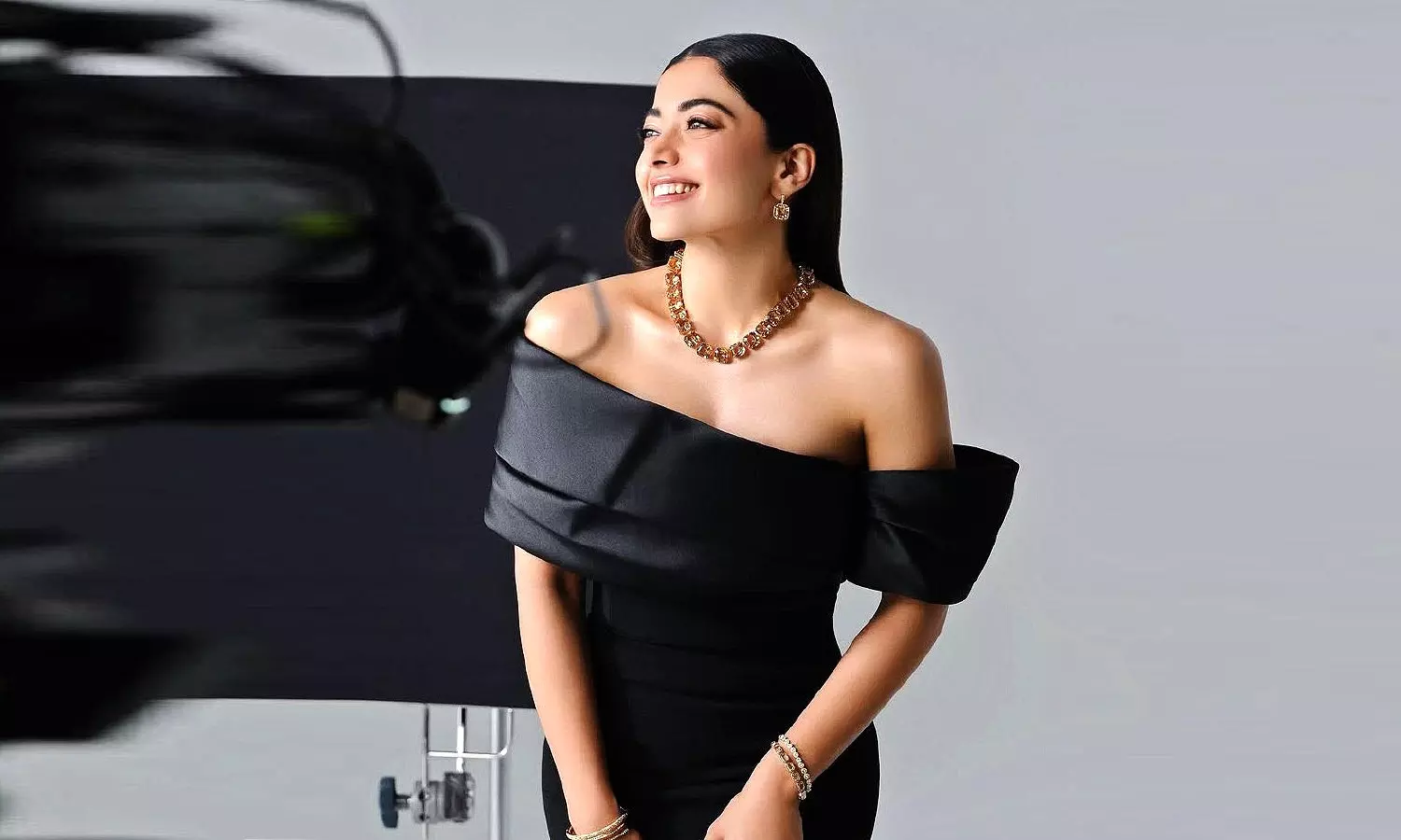 Rashmika Mandanna dons a sophisticated off-shoulder black dress, complemented by an array of stunning gold jewelry, including a chunky necklace, layered bracelets, and dangling earrings.