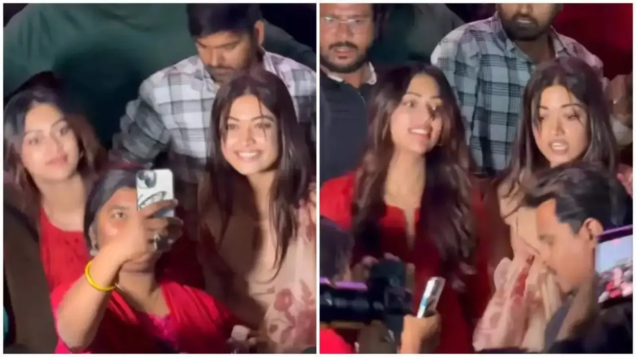 In the midst of all this, her bouncer tried to push way her woman fan and seeing this; Rashmika stopped him and posed for a selfie with her.