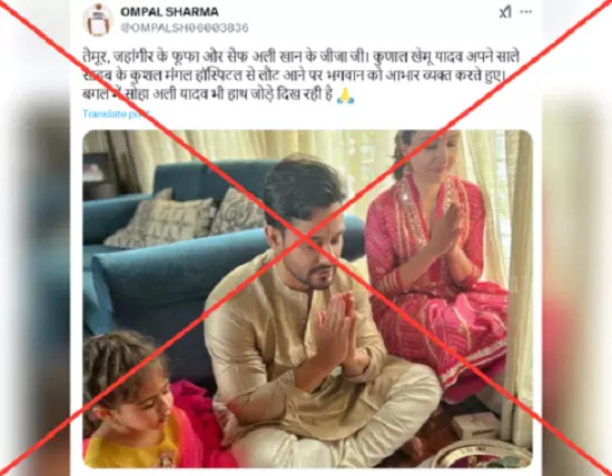 Multiple social media users shared an image claiming it showed Bollywood actor Kunal Kemmu, his wife Soha Ali Khan, and their daughter Inaaya Naumi praying for Saif Ali Khan's well-being after his discharge from the hospital. However, the Desk found that the image is from their Diwali celebrations dated November 4, 2021.