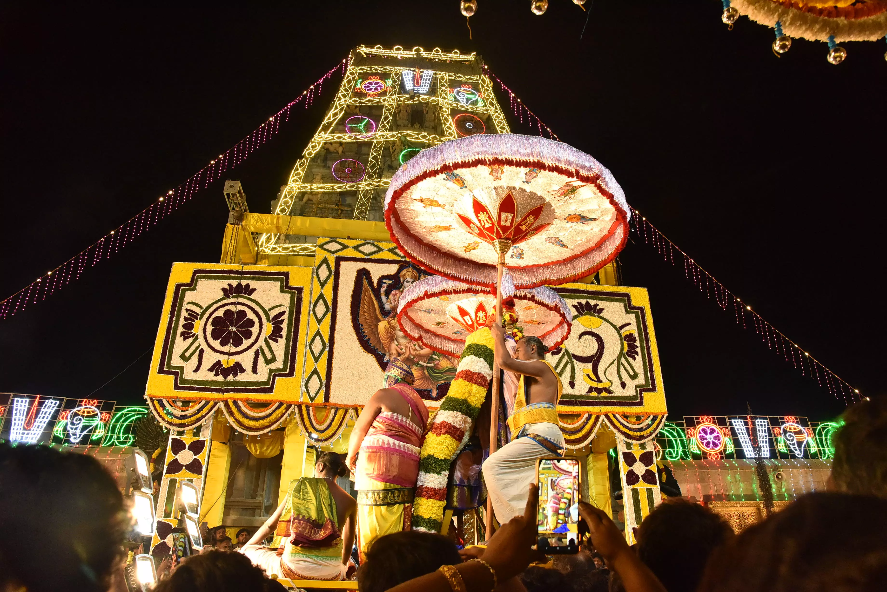 The TTD Sri Venkateswara Swamy temple in Jubilee Hills is beautifully illuminated for the ongoing Brahmotsavam, drawing a heavy rush of devotees on Saturday evening. (Photo: R. Pavan)