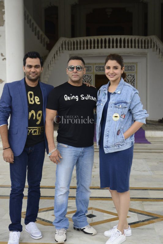 Director Ali Abbas Zafar, Salman Khan and Anushka Sharma at Sutlan press meet.