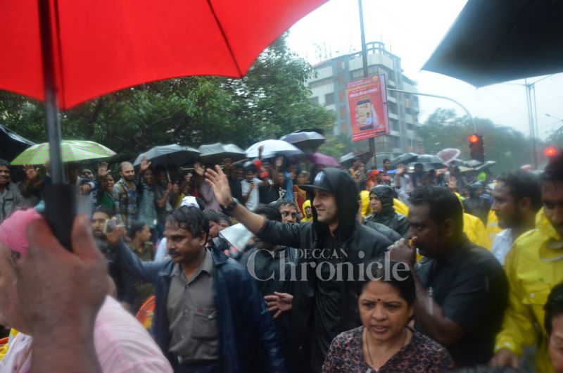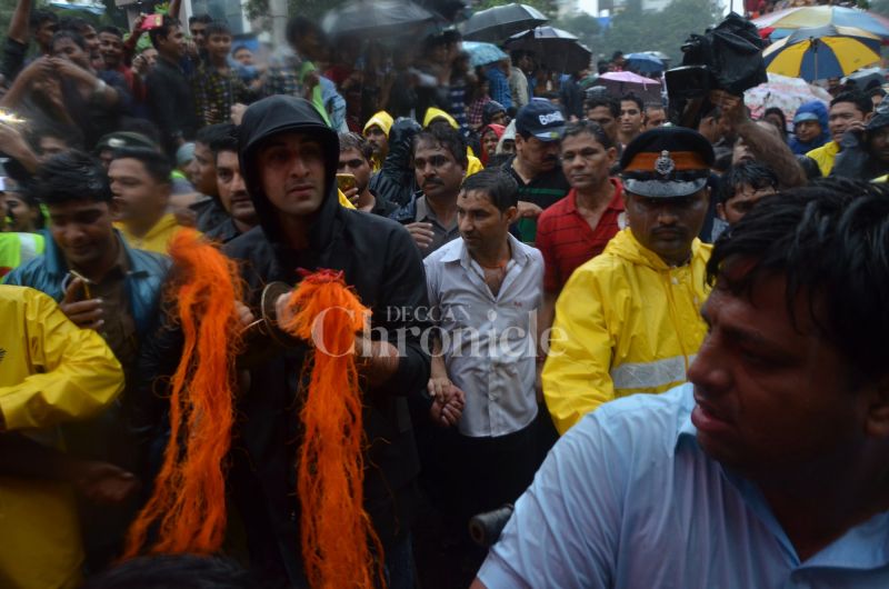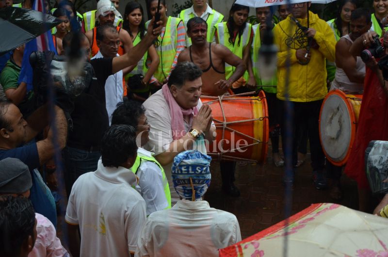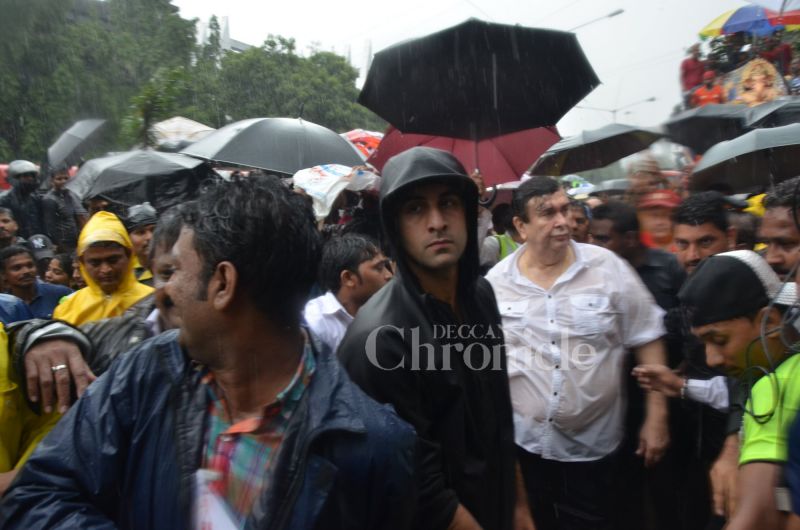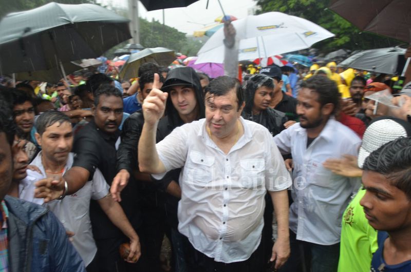 On Thursday, Randhir, Rishi, Rajiv and Ranbir Kapoor celebrated Bappa\'s farewell. With heavy downpour, the Kapoor\'s chanted \'Morya\' as they bid adieu to their RK Studios\' Lord Ganesha. (Photo: Viral Bhayani)
