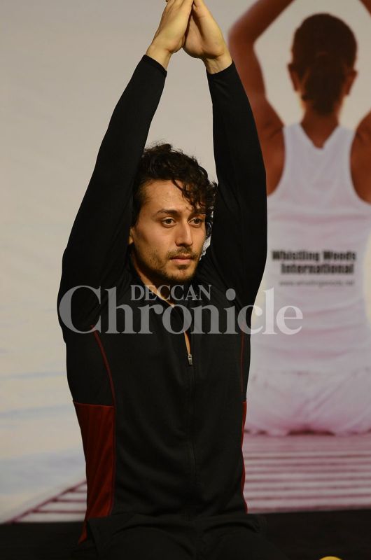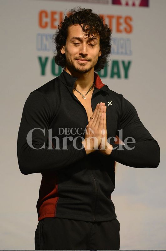 Bollywood star Tiger Shroff celebrated International Yoga Day with students at Subhash Ghai's film institute.