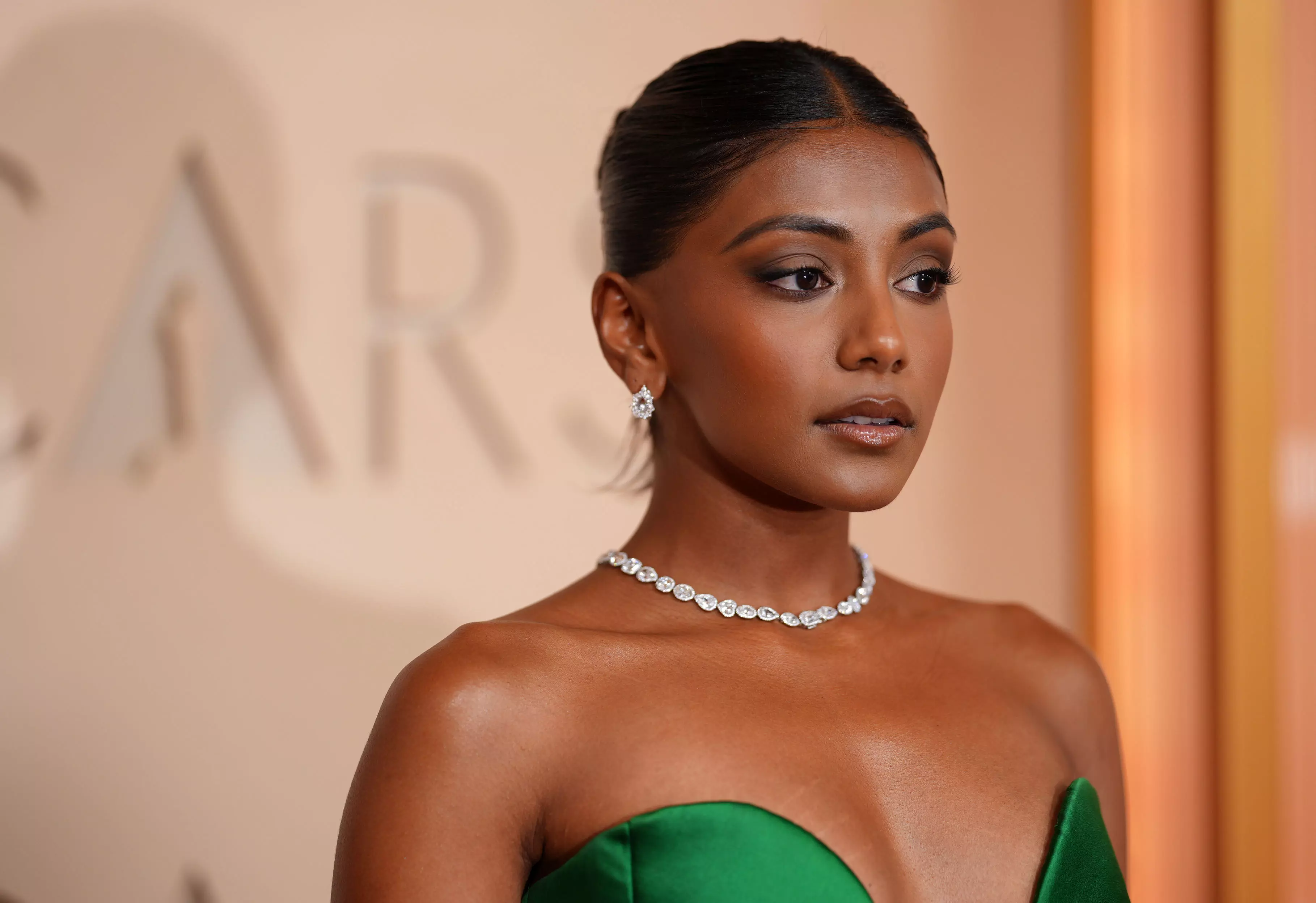 Charithra Chandran arrives at the Oscars on Sunday, March 15, 2026, at the Dolby Theatre in Los Angeles. (Photo by Richard Shotwell/Invision/AP)