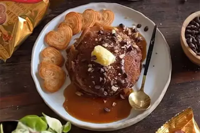 Cook the batter in a butter-coated pan, flipping when little dots form. Stack the pancakes, drizzling with Belgian chocolate sauce, and top with a knob of butter, crushed Britannia Little Hearts, and chocolate chips. Add more cookies on the side. For a convenient breakfast, pre-make the batter and store it in the fridge for pancakes on the go. This recipe combines the crunch of Britannia Little Hearts with the fluffiness of pancakes, making for a unique and tasty treat.