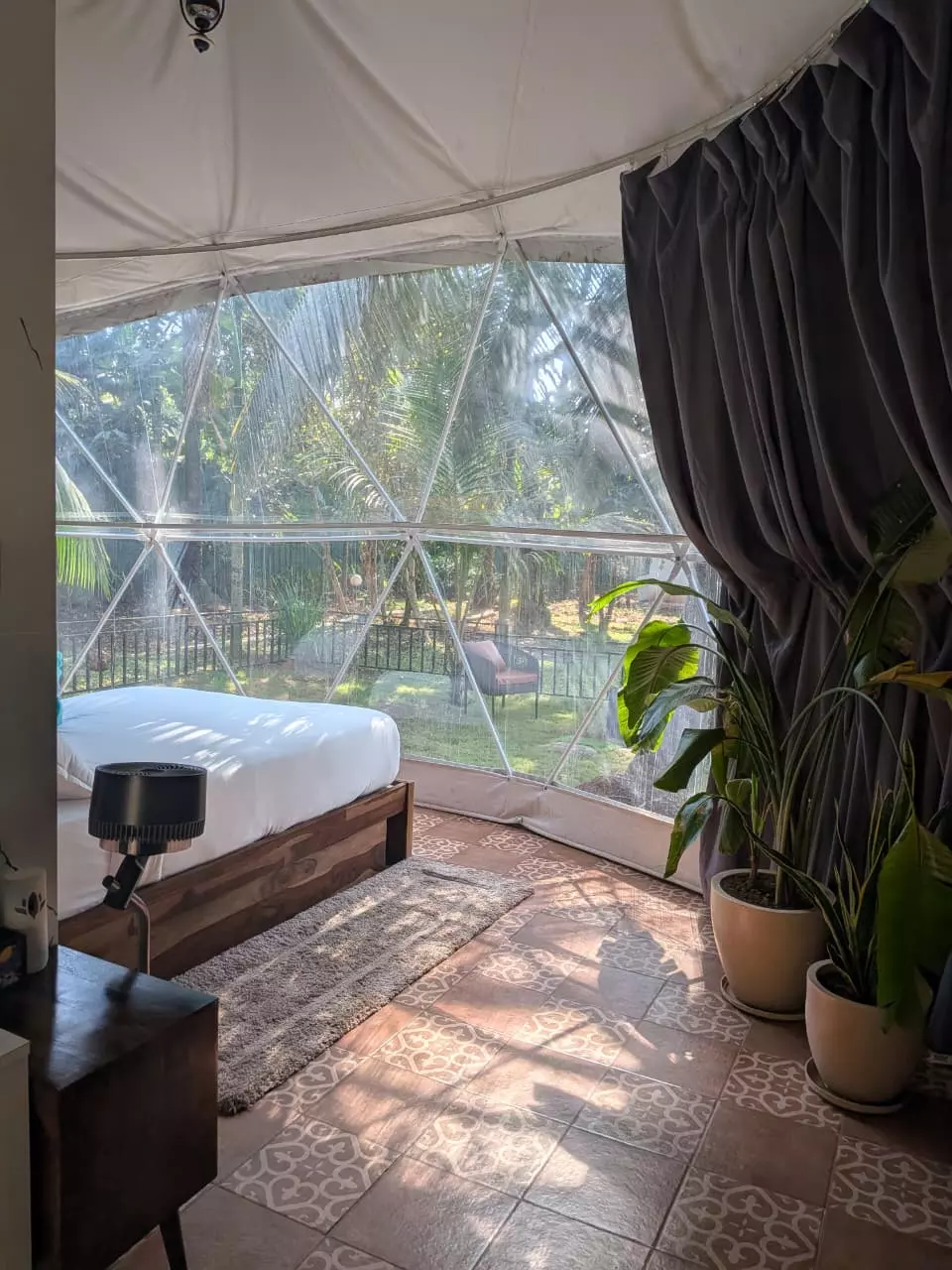 Accommodation here reflects the same thinking. Noor, the dome-style luxury room where guests check in, feels cocooned rather than enclosed. Curved architecture, soft light, and an indoor-outdoor flow slow the senses the moment you step inside. Curtains open all the way up to the ceiling, allowing guests to watch the sky change or even fall asleep under the stars. “Ethically, I didn’t want to over-construct,” Karan explains. “This land is a forest space. We wanted to keep it light, reversible and respectful to nature.”
