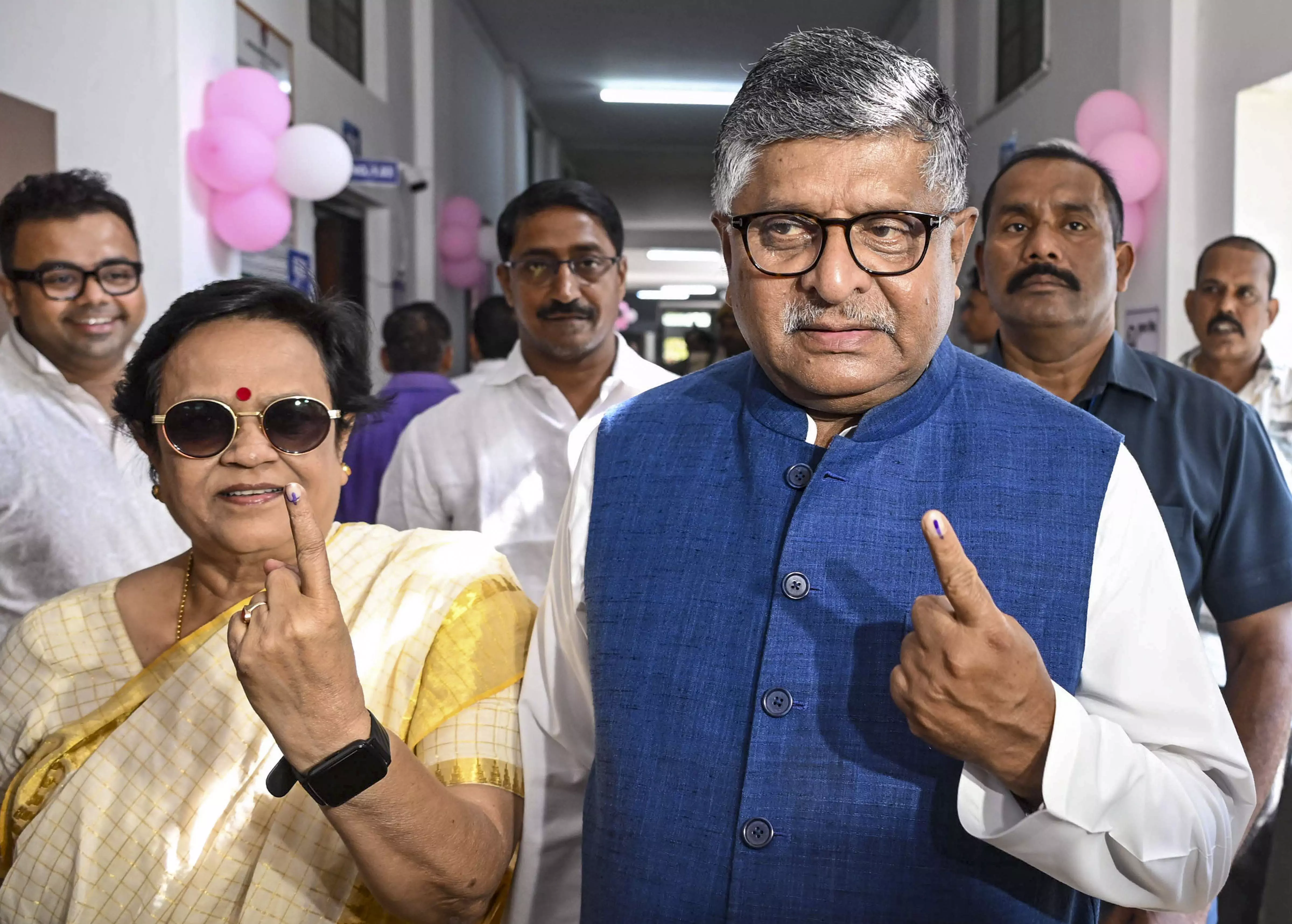 BJP MP Ravi Shankar Prasad and his wife Maya Shankar cast their votes at a polling booth in Patna during the first phase of the Bihar polls.
