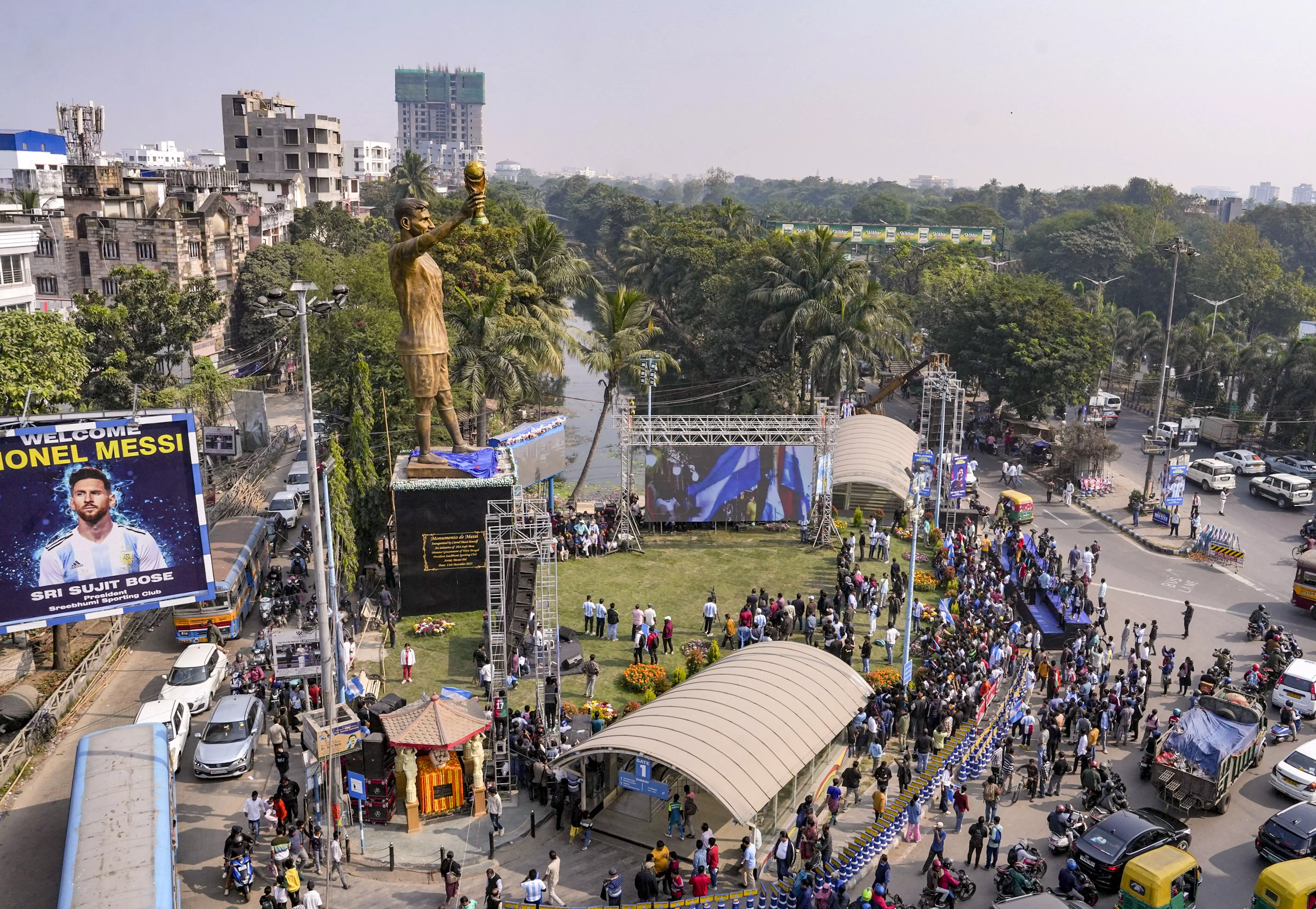 Kolkata: People gather near the newly unveiled 70-foot statue of Argentine footballer Lionel Messi in Kolkata, Saturday, Dec. 13, 2025. Messi virtually unveiled the statue as part of his 'G.O.A.T. India Tour 2025.' - PTI