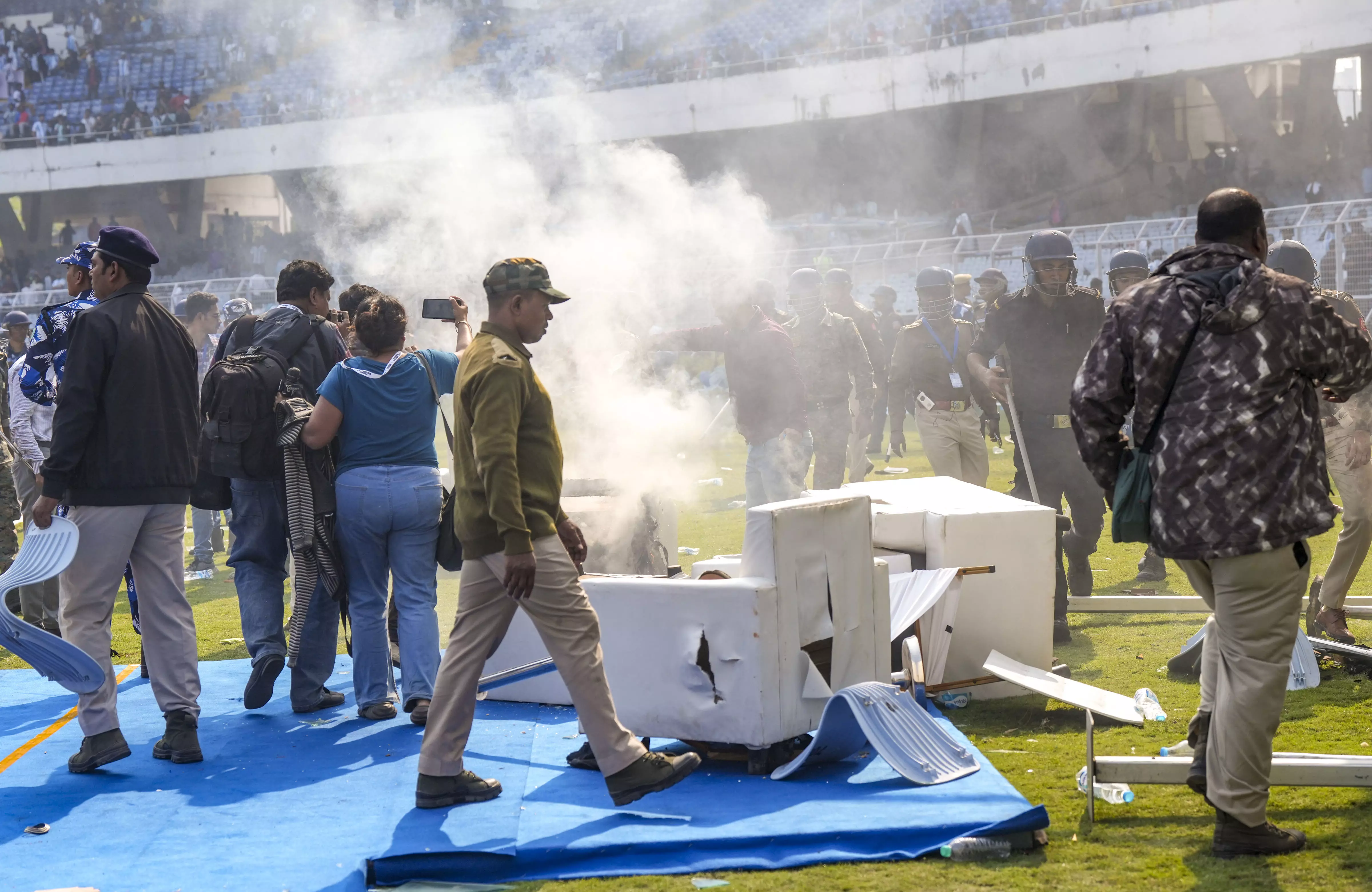 Such was the situation that promoter Shatadru Datta, organiser of the ‘GOAT Tour', along with security personnel, had to whisk Messi away as the Salt Lake Stadium turned into a scene of political one-upmanship, with supporters of the ruling Trinamool Congress breaching security and entering the field of play. Fans, who had paid between Rs 4,500 and Rs 10,000 for tickets to watch the Argentine star, hurled bottles and damaged fibreglass seats, forcing the police to intervene as they struggled to bring the situation under control.