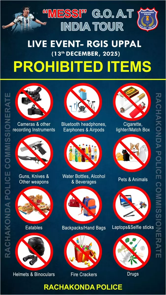 The Hyderabad Police, under the Rachakonda Commissionerate, have issued a strict list of prohibited items for spectators attending Lionel Messi's "GOAT India Tour 2025" at the Rajiv Gandhi International Stadium in Uppal. These measures are designed to enhance crowd control, public safety, and ensure an orderly event, especially following disturbances at the Kolkata leg of the tour.