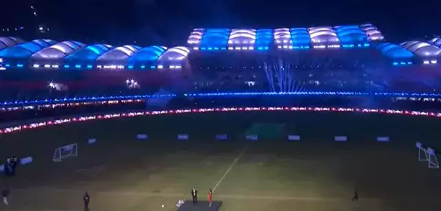Laser lights dazzle Uppal Stadium as Hyderabad welcomes the GOAT with a stunning pre-match show.