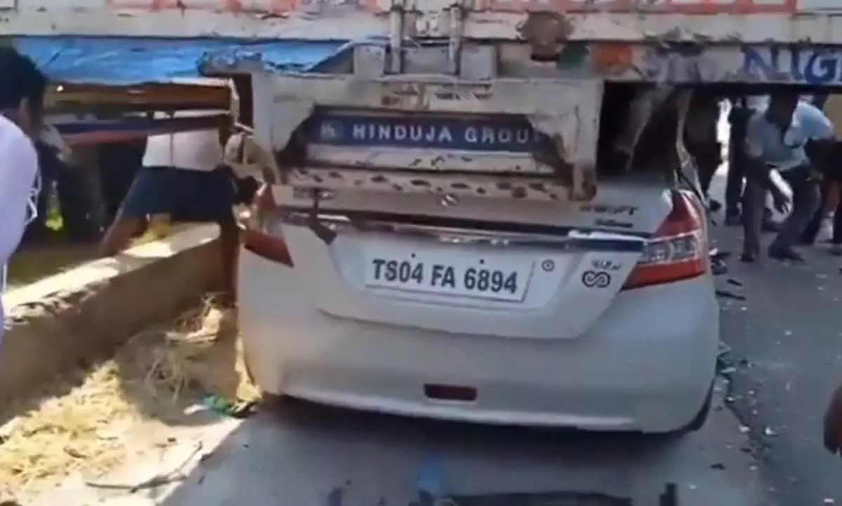 Hyderabad: Two youngsters died on the spot after the car in which they were travelling rammed a parked truck and the vehicle was stuck under the container at Suryapet on Monday.