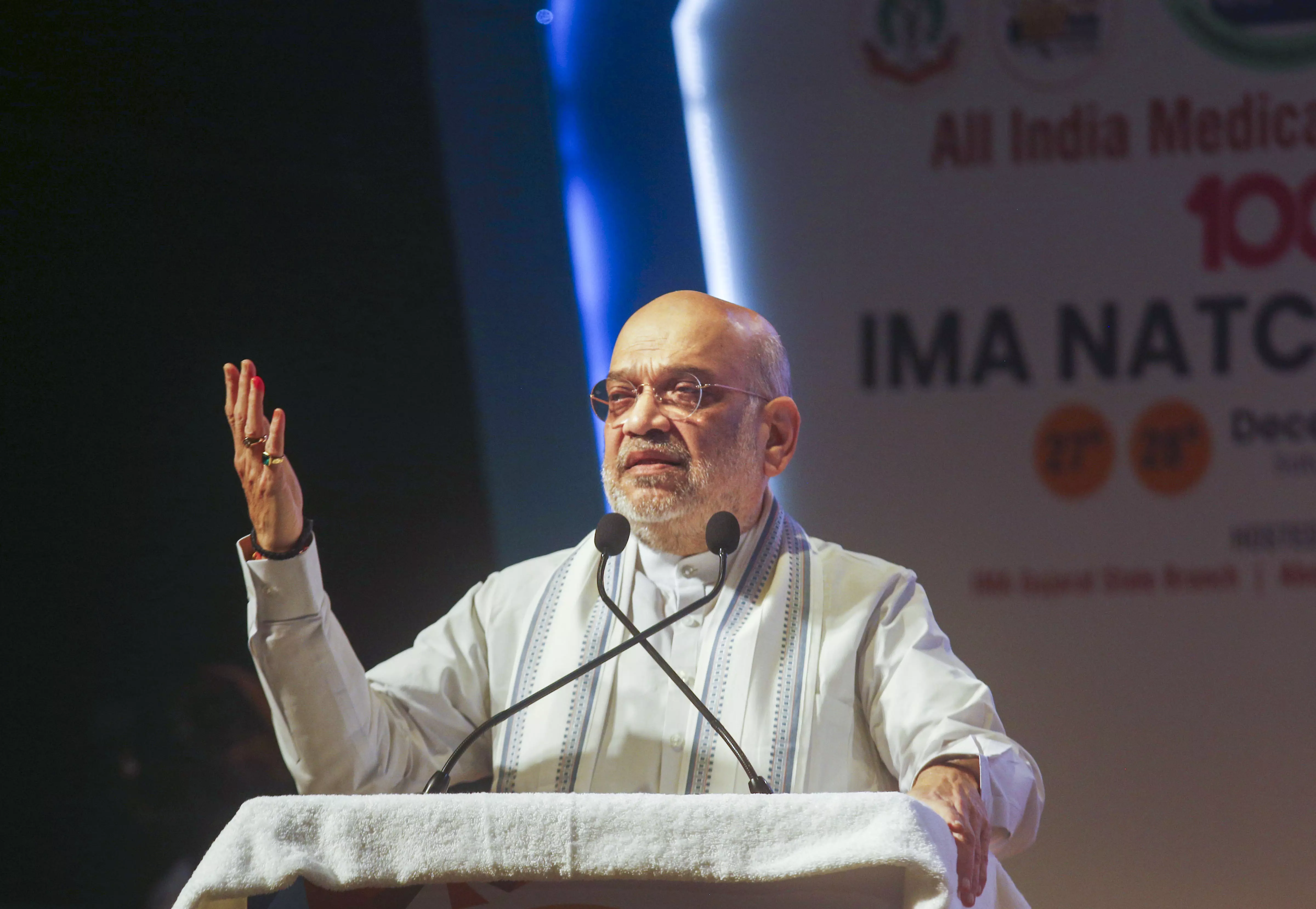 Union Home Minister Amit Shah addresses the gathering during the 100th ‘Indian Medical Association Natcon 2025’, in Ahmedabad, Sunday, Dec. 28, 2025. (PTI Photo)