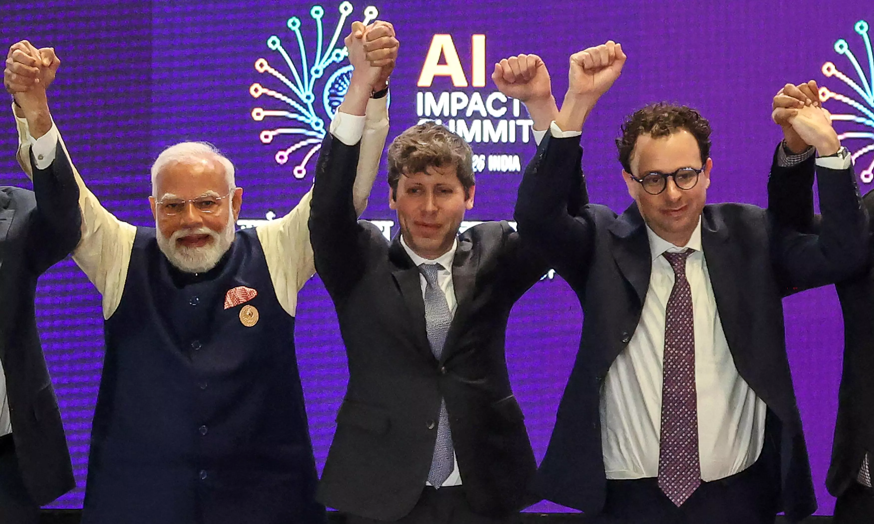 India's Prime Minister Narendra Modi (L) takes a group photo with AI company leaders including OpenAI CEO Sam Altman (C) and Anthropic CEO Dario Amodei (R) at the AI Impact Summit in New Delhi on February 19, 2026. (Photo by Ludovic MARIN / AFP)
