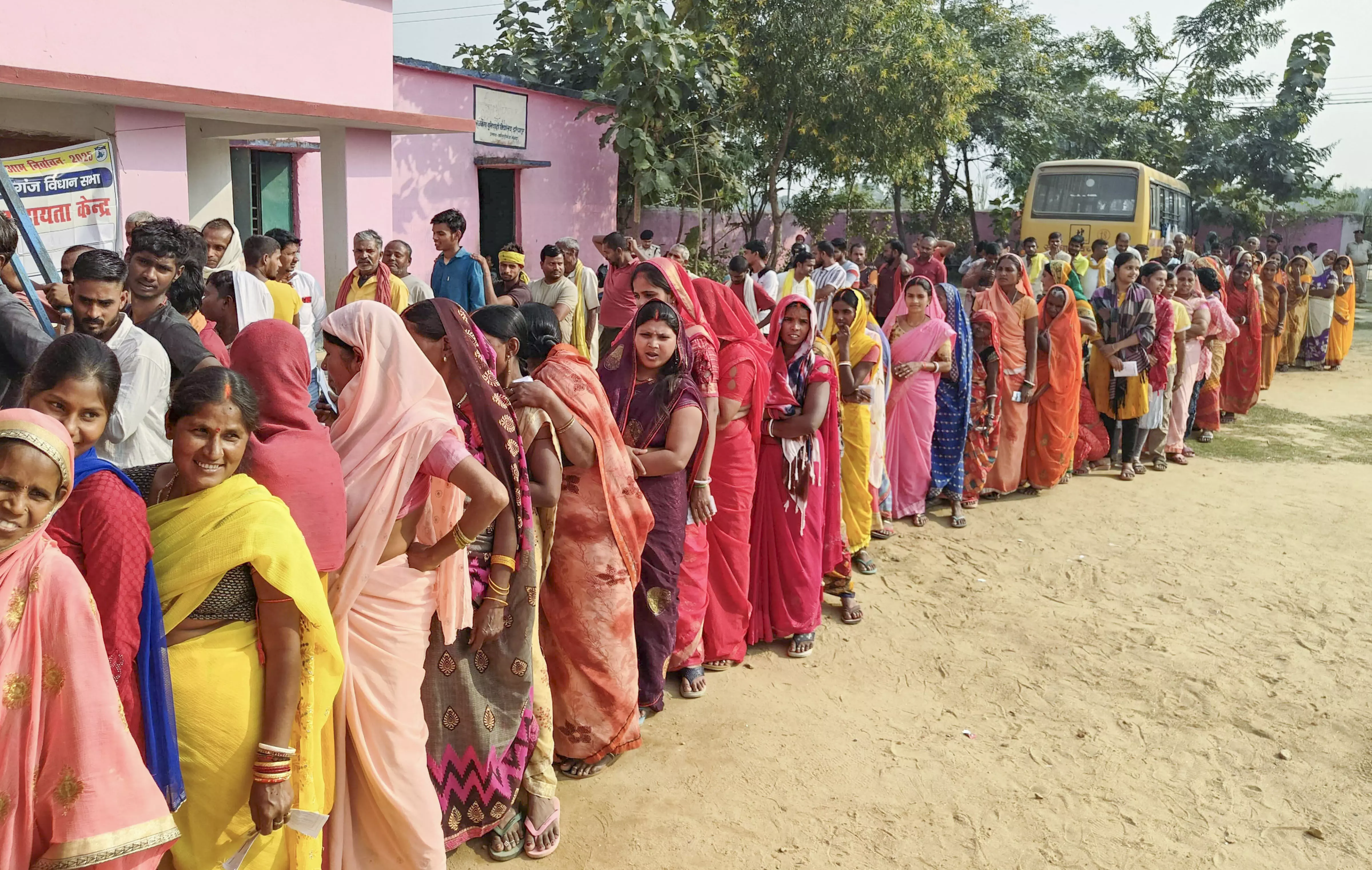 Voters wait in queues to cast their votes during the second and final phase of the Bihar Assembly elections, in Nawada, Bihar, Tuesday, Nov. 11, 2025. (PTI Photo)