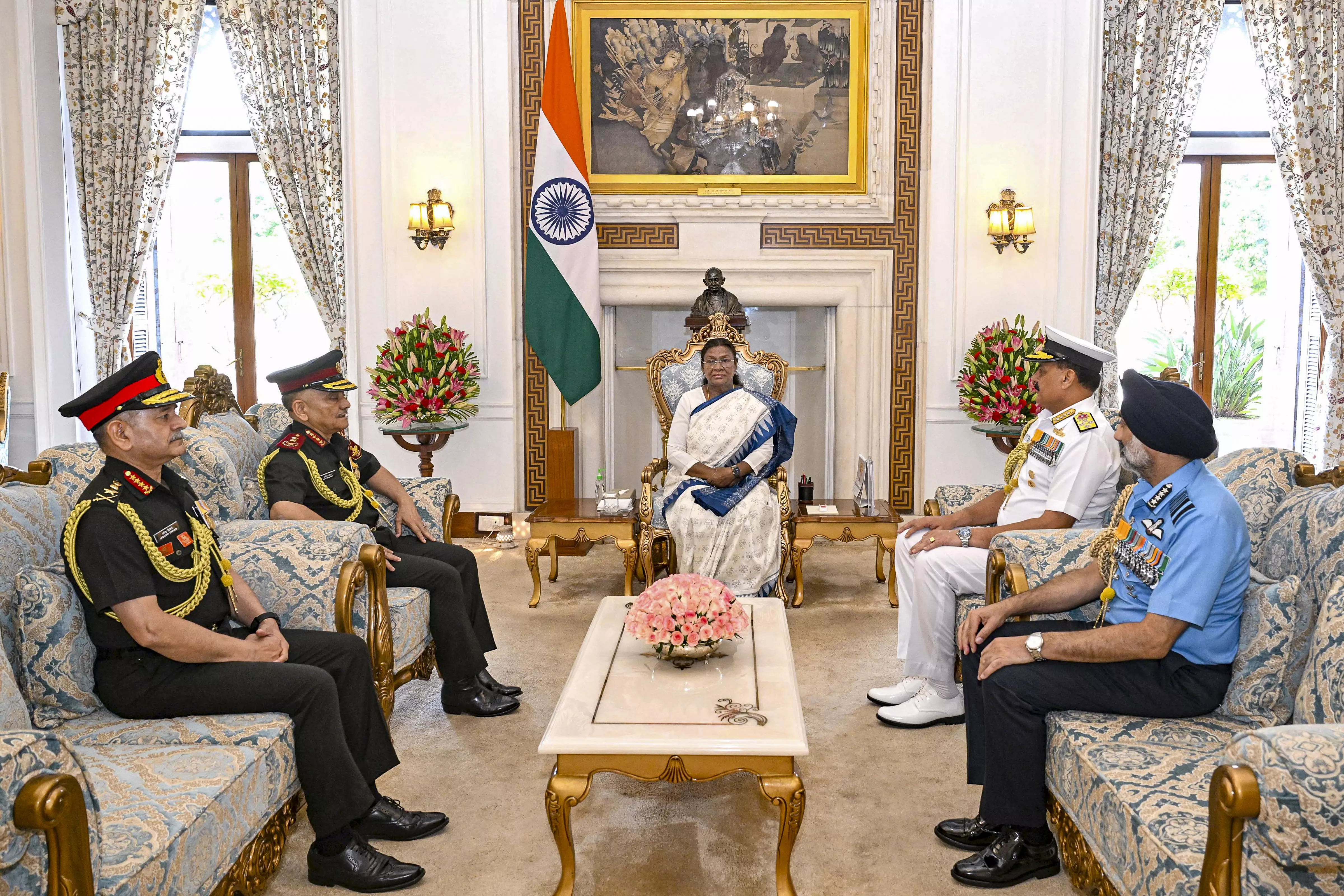 President Droupadi Murmu with Chief of Defence Staff General Anil Chauhan, Army Chief General Upendra Dwivedi, Navy Chief Admiral Dinesh K Tripathi and Chief of the Air Staff Air Chief Marshal AP Singh during a meeting, in New Delhi. (@rashtrapatibhvn via PTI Photo)