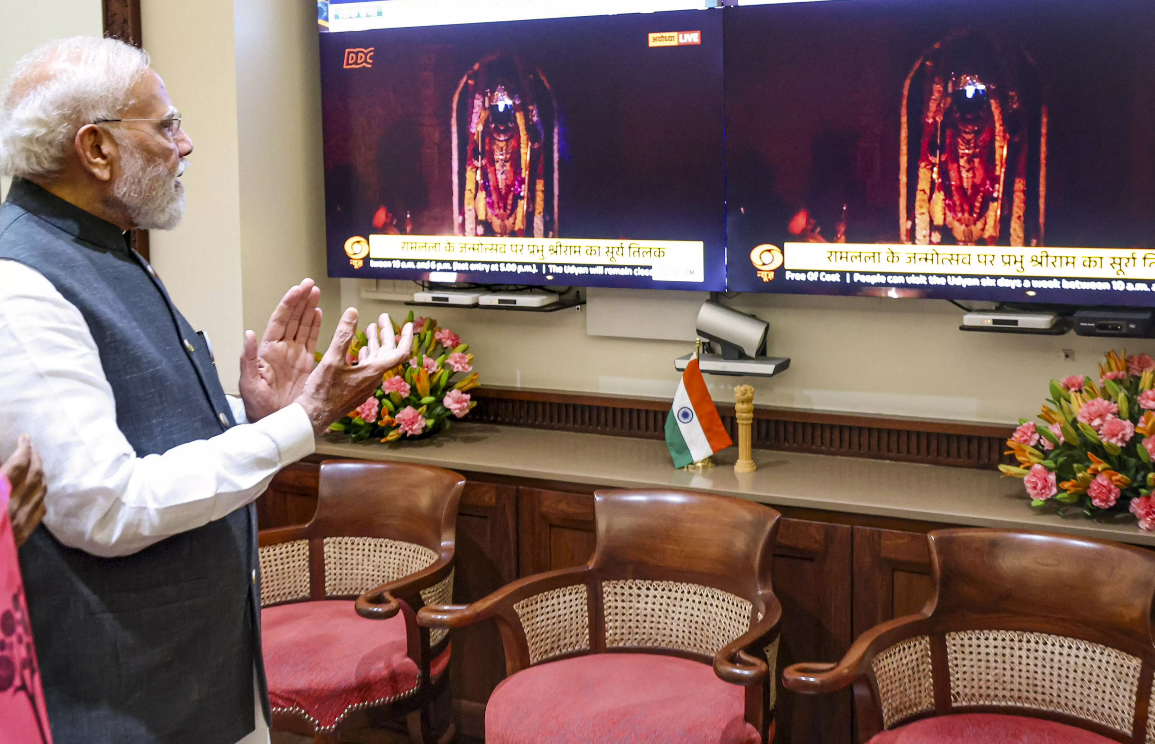 New Delhi: Prime Minister Narendra Modi on Friday virtually witnessed the 'Surya Tilak' ceremony held at the Ram temple in Ayodhya on the occasion of Ram Navami, which was marked by religious fervour and drew lakhs of devotees to the holy town. The festival, marking the birth of Lord Ram, falls on the ninth day of Chaitra Navratri. The 'Surya Tilak' illuminated Ram Lalla's idol at the grand temple.