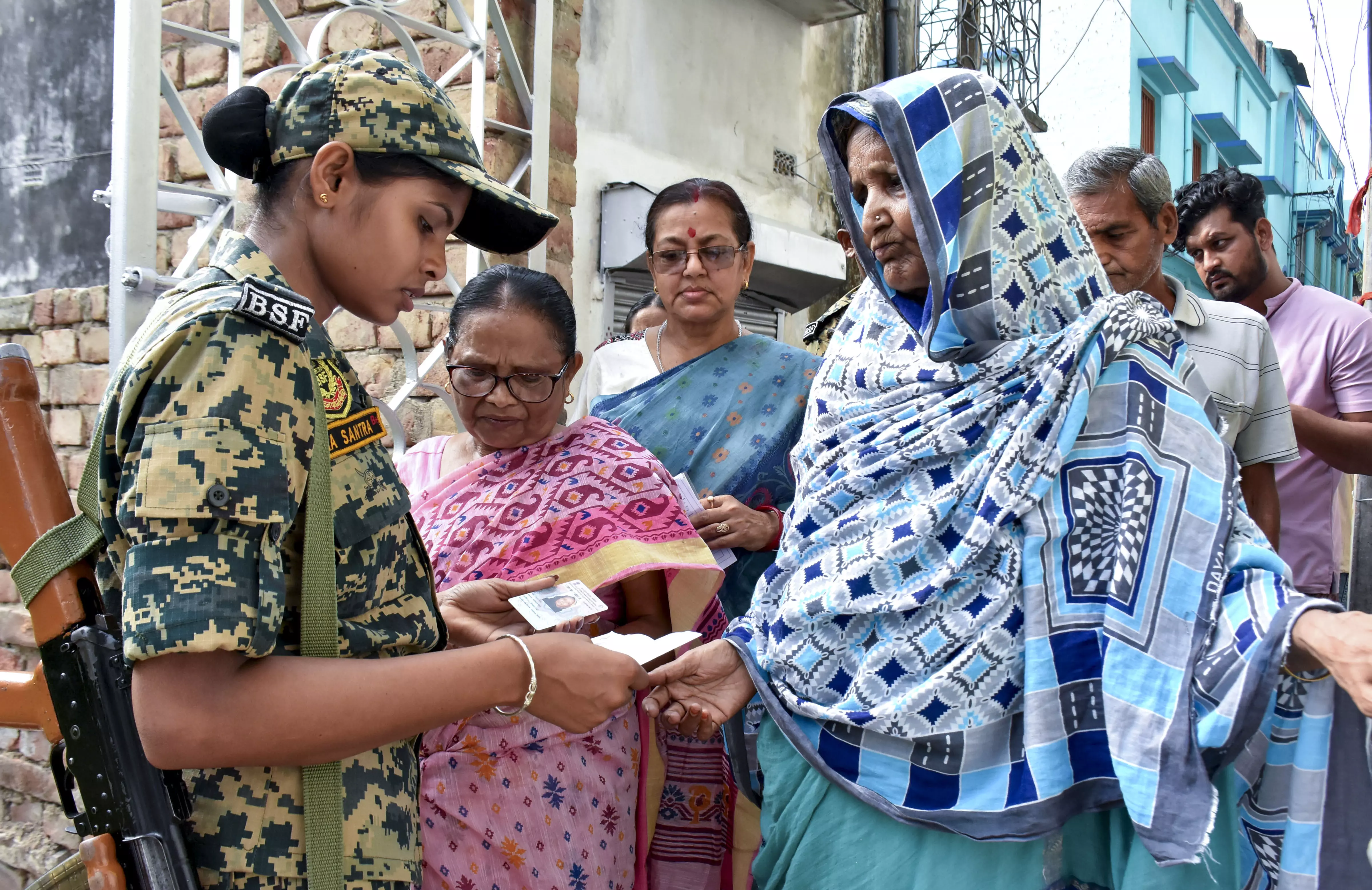 Murshidabad: Security check underway at a polling station during voting in the first phase of the West Bengal Assembly elections, in Murshidabad, Thursday, April 23, 2026. (PTI Photo)