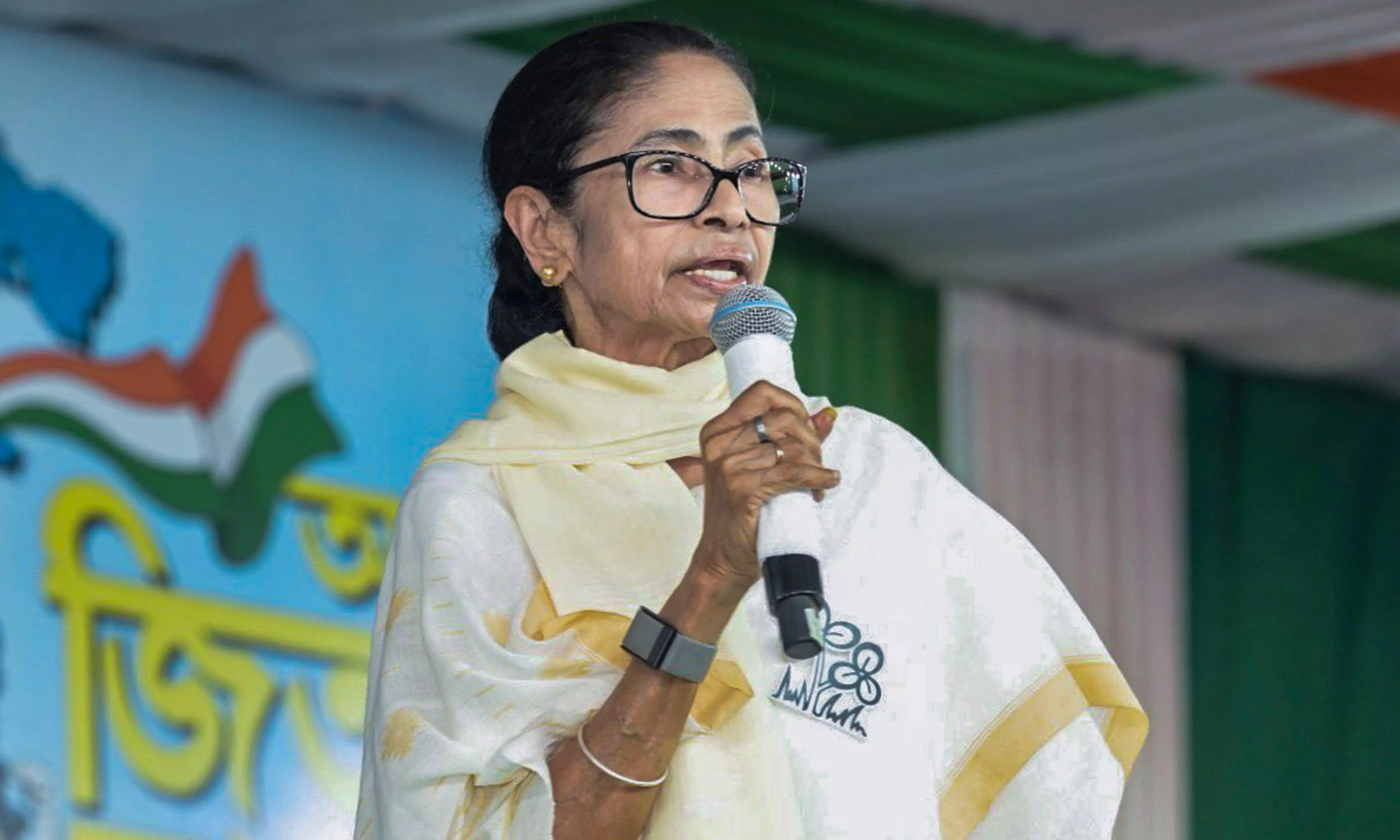 In this image posted on April 23, 2026, West Bengal Chief Minister Mamata Banerjee addresses a public meeting in support of party candidate Nayna Bandyopadhyay, unseen, in Kolkata. (@AITCofficial/X via PTI Photo)