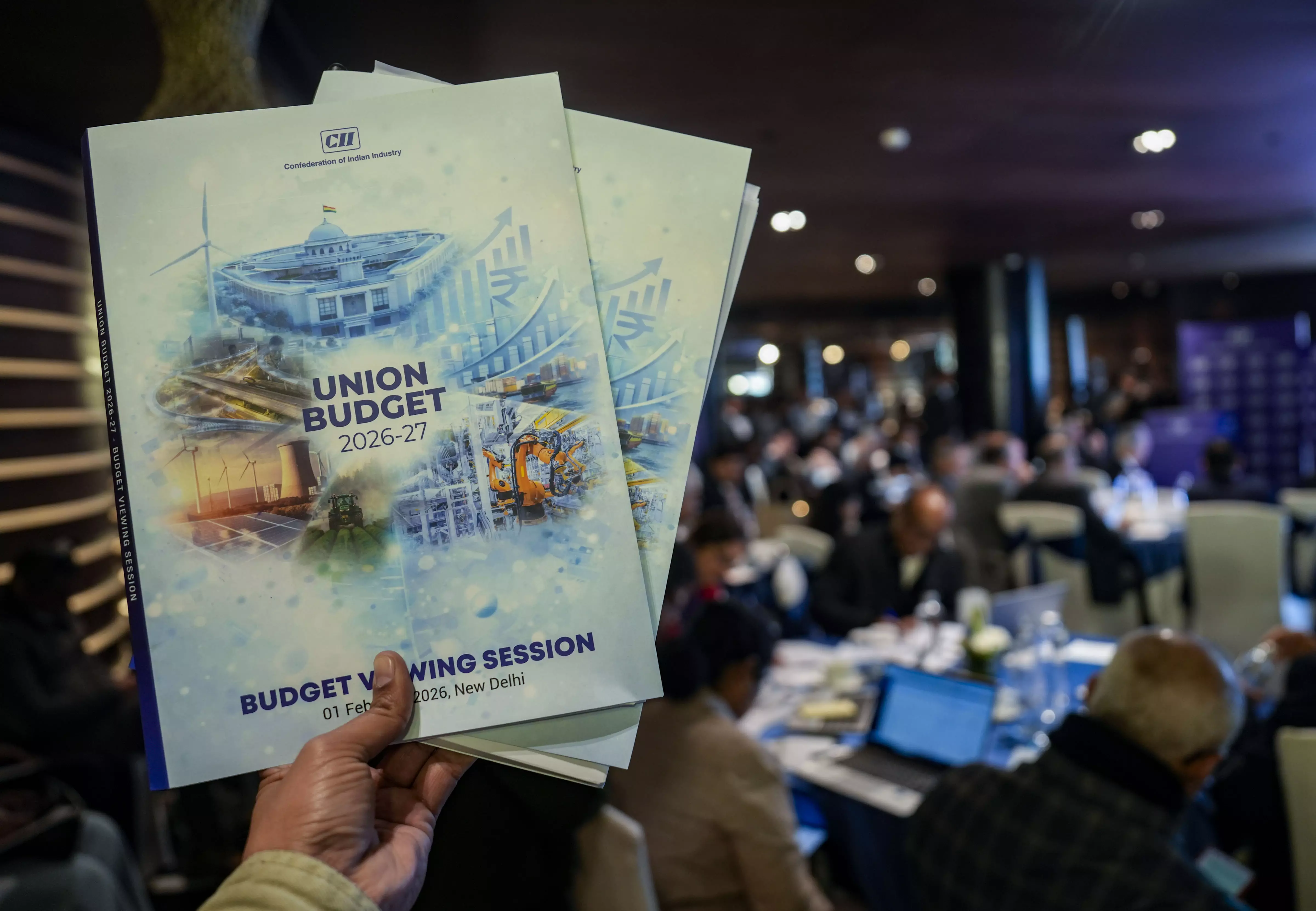 A person shows booklets of the viewing session by Confederation of Indian Industry (CII) members for the ‘Union Budget 2026-27’ presentation, in New Delhi, Sunday, Feb. 1, 2026. (PTI Photo/Salman Ali)