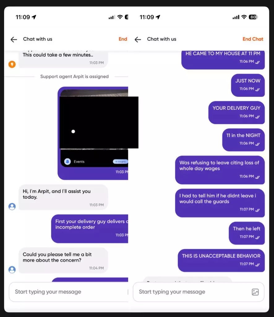 Around 11 pm, the same delivery agent, along with another person, reached her residence and asked her to come outside and take the order. Upon her refusal to do so, he pleaded that his day’s wage would be cut over this issue and insisted that she receive the remaining order from him.