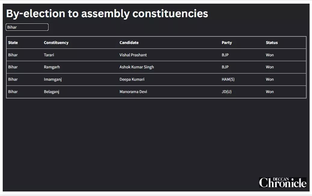 The ruling NDA in Bihar on Saturday swept the bypolls to four assembly segments, retaining Imamganj and wresting from the INDIA bloc Tarari, Ramgarh and Belaganj, receiving a boost ahead of the assembly elections due next year.