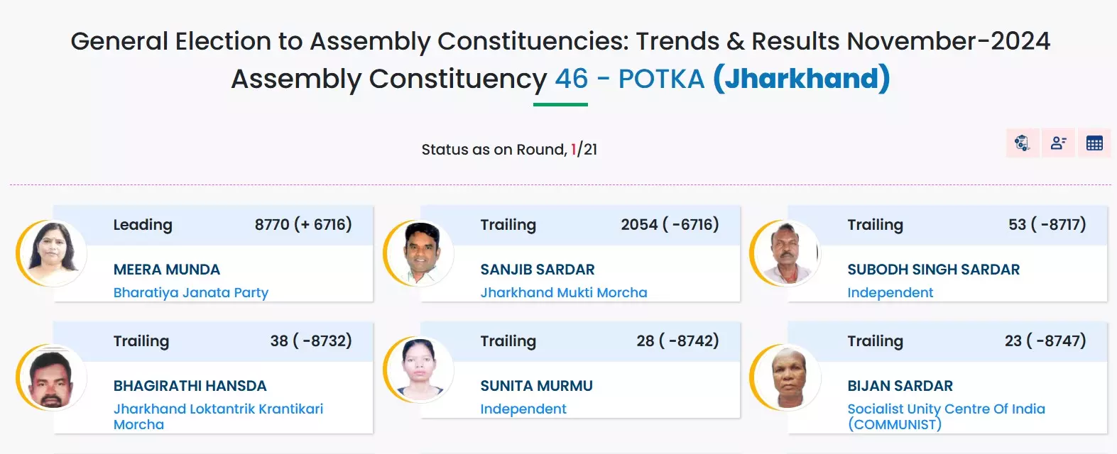 BJP candidate and former CM Arjun Munda’s wife, Meera Munda, is trailing from the Potka Assembly constituency.