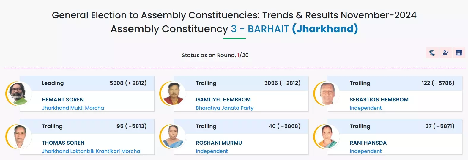 JMM candidate and Chief Minister Hemant Soren’s brother, Basant Soren, is leading from the Dumka Assembly seat.