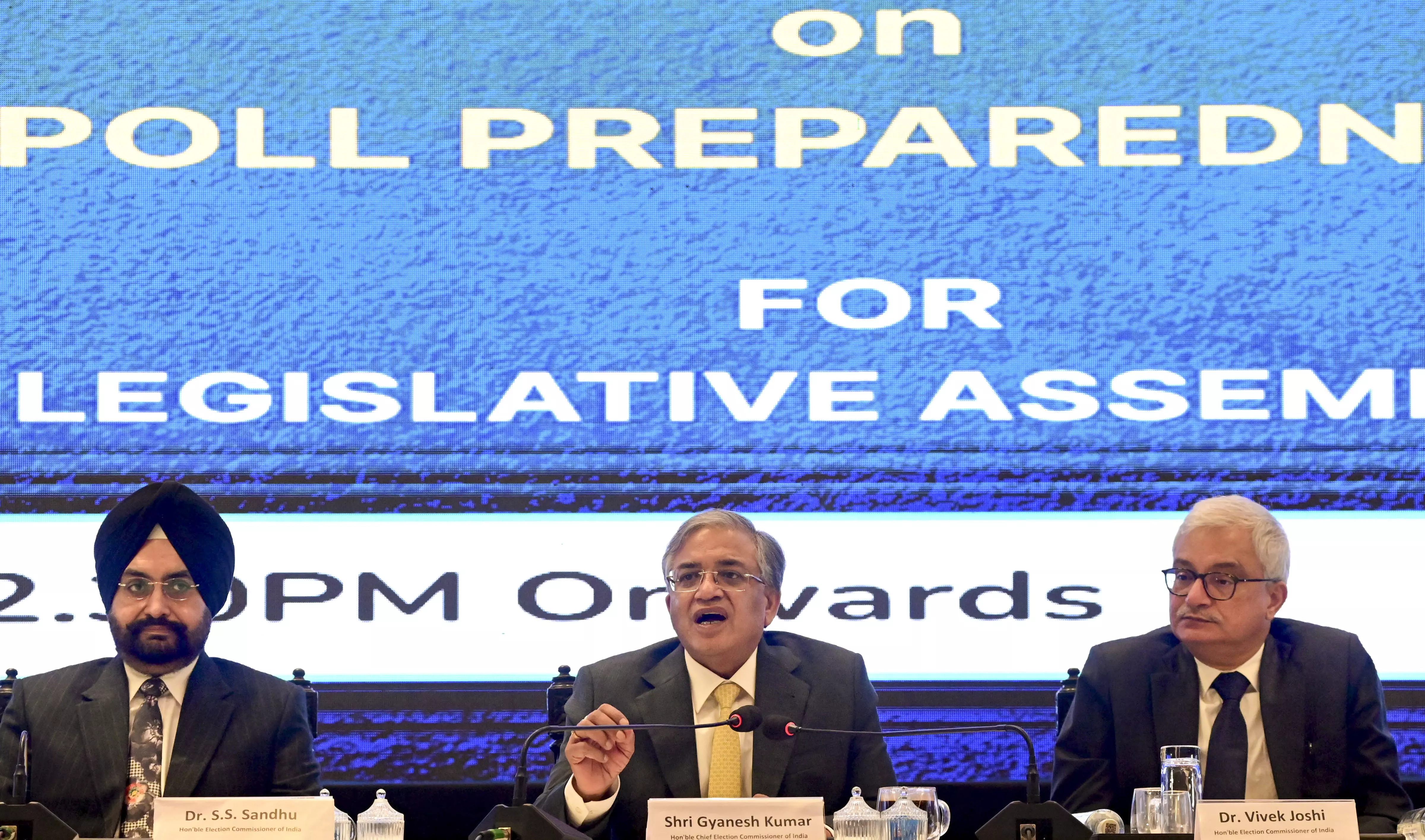 Kolkata: Chief Election Commissioner Gyanesh Kumar interacts with media persons as Election Commissioners S S Sandhu, and Vivek Joshi look on during a press conference on poll preparedness for the General Election to the West Bengal Legislative Assembly 2026, at Rajarhat on the outskirts of Kolkata, Tuesday, March 10, 2026. (PTI Photo)