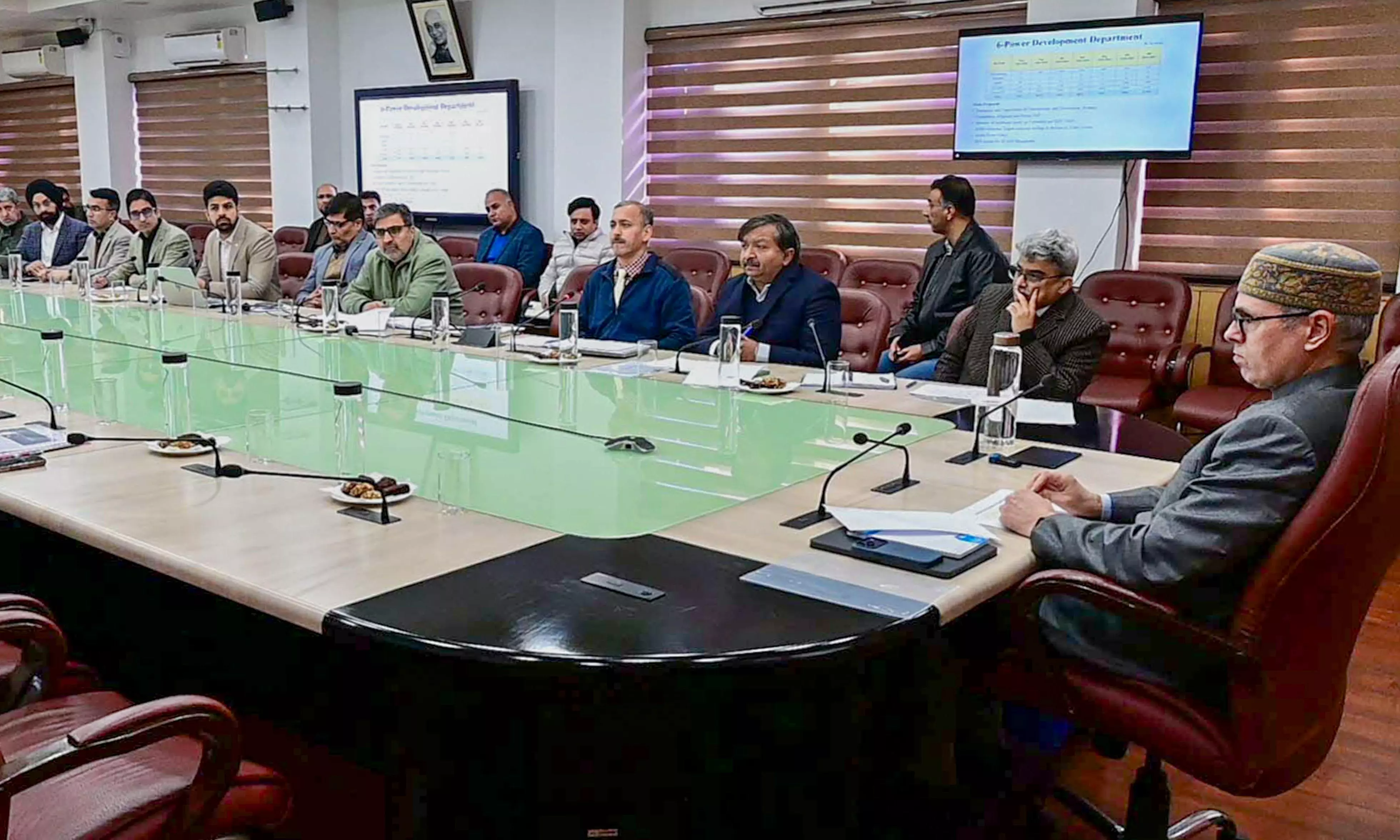 Jammu and Kashmir Chief Minister Omar Abdullah, right, chairs a pre-budget consultation meeting ahead of the Budget Session of the Jammu and Kashmir Legislative Assembly, in Jammu, Tuesday, Jan. 20, 2026. (PTI Photo)
