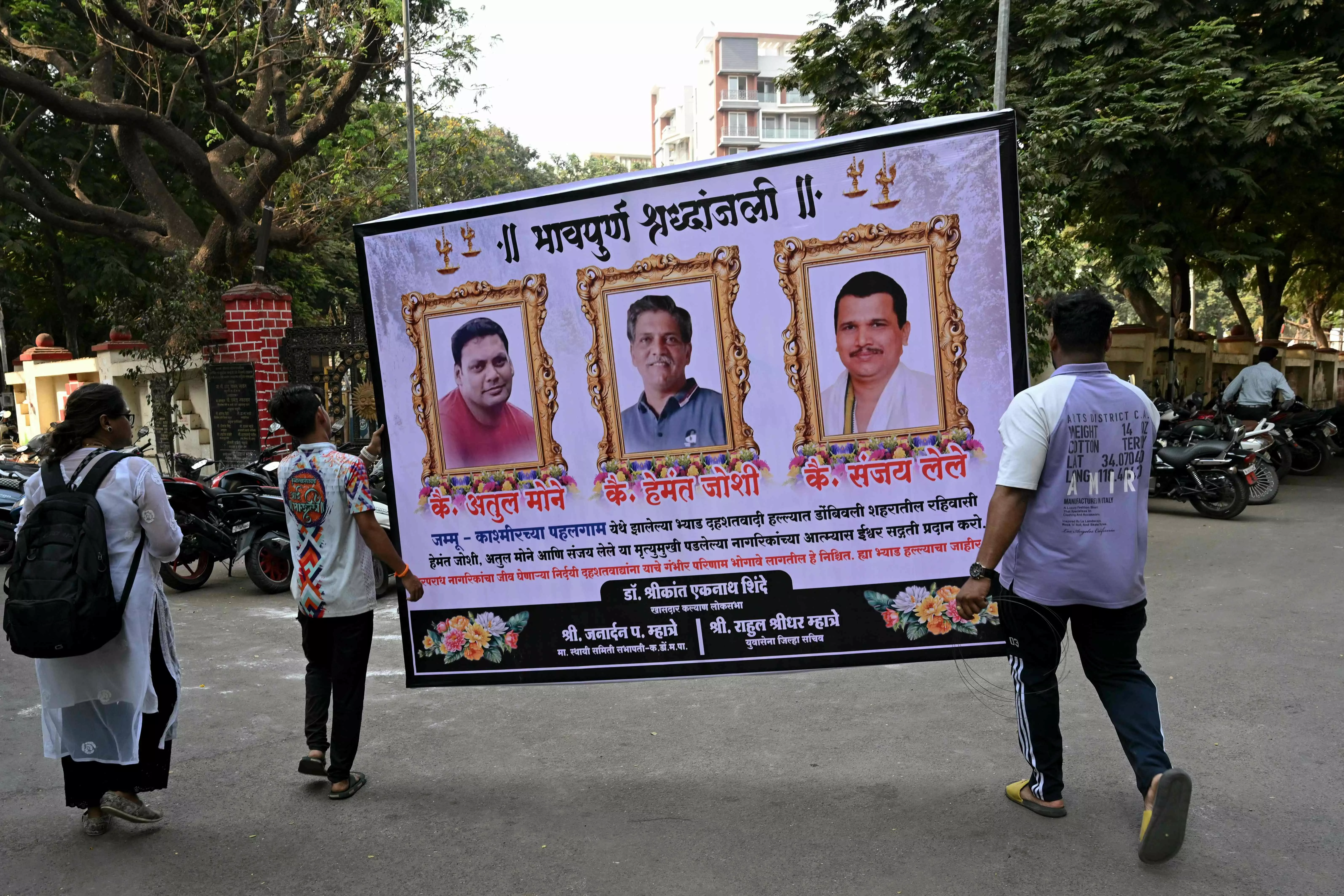 A condolence poster is pictured near victims residence in Dombivali on April 23, 2025, that portrays the deceased (L-R) Atul Mone, Hemant Joshi, Sanjay Lele who were killed by terrorists in Kashmir's Pahalgam. Indian security forces in Kashmir carried out a major manhunt on April 23, a day after gunmen opened fire on tourists killing 26 people in the regions deadliest attack on civilians since 2000. — AFP
