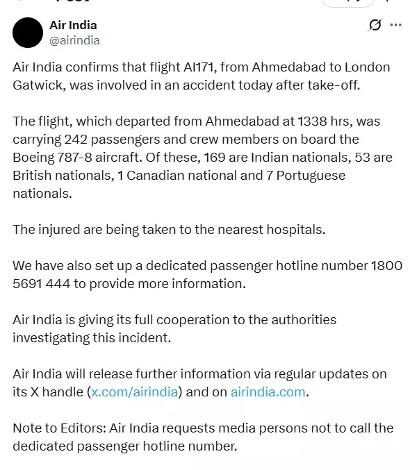 Following the Ahmedabad plane crash, Air India has released a hotline for passengers’ families and relatives. For any information, people can call 1800 5691 444. Rescue operations and investigations are ongoing at the crash site near Sardar Vallabhbhai Patel International Airport.