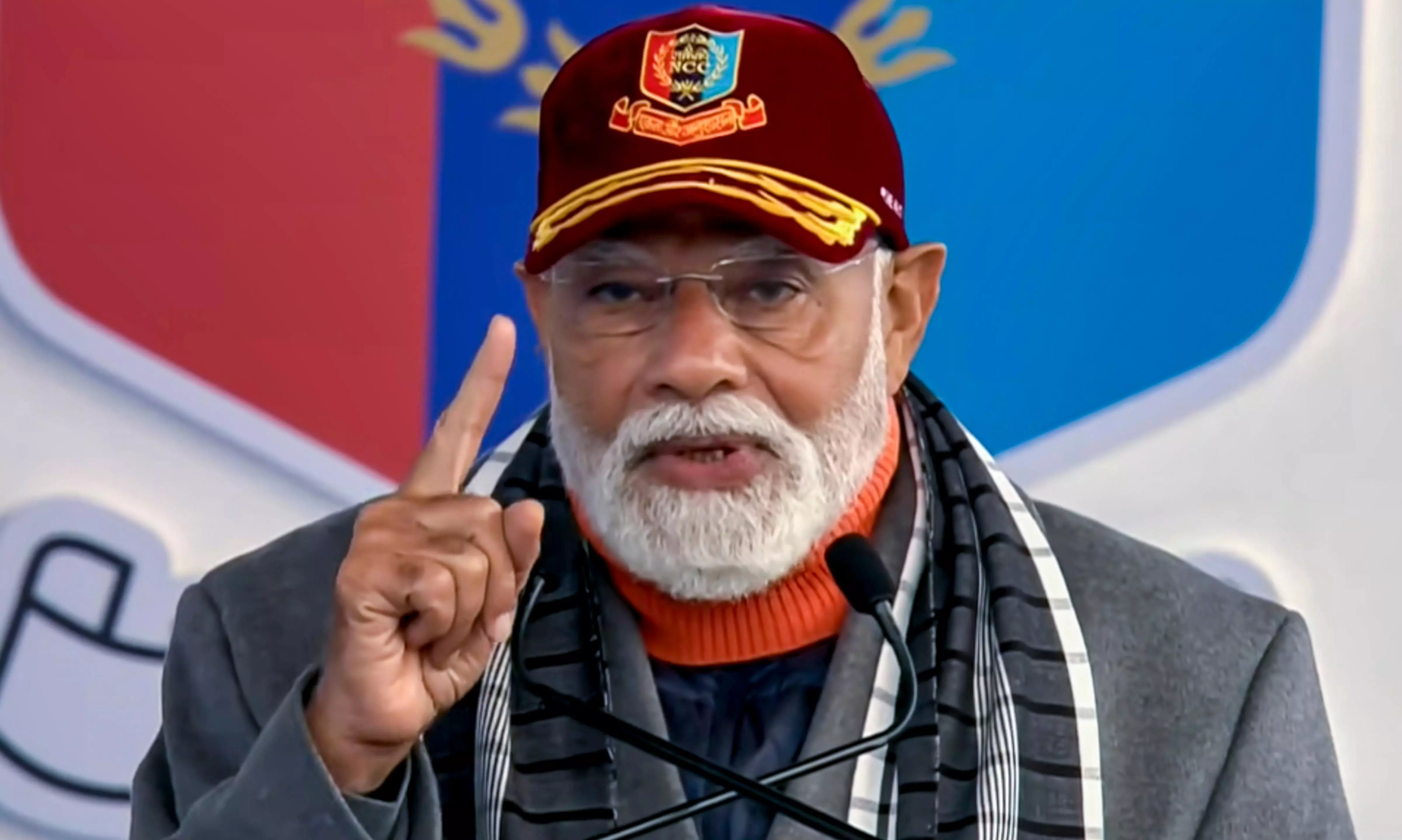 In this screengrab from a video released on Jan. 28, 2026, Prime Minister Narendra Modi addresses a gathering during NCC Rally at Cariappa Ground, in New Delhi. (@NarendraModi/YT via PTI Photo)