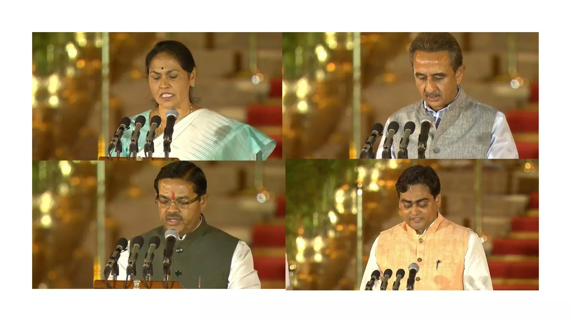 From top right: Shobha Karandlaje, Kirti Vardhan Singh, BJP leader from Badaun district of Uttar Pradesh, B. L. Verma and BJP Leader Shantanu Thakur, first non-TMC MP to be elected from Bangaon, West Bengal, since its delimitation take oath