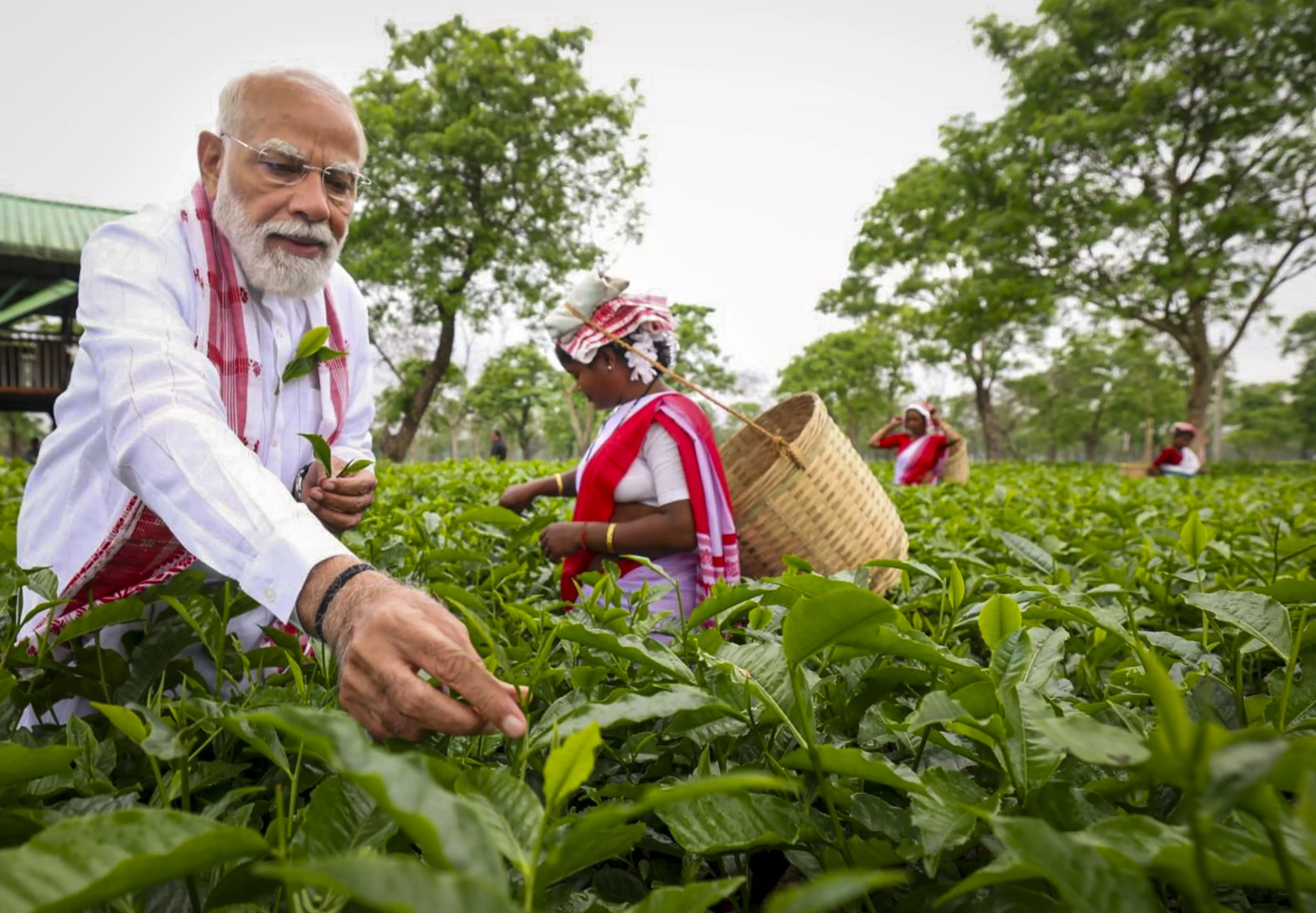 Modi was also seen plucking tea leaves with a group of women attired in traditional white and red bordered sarees.