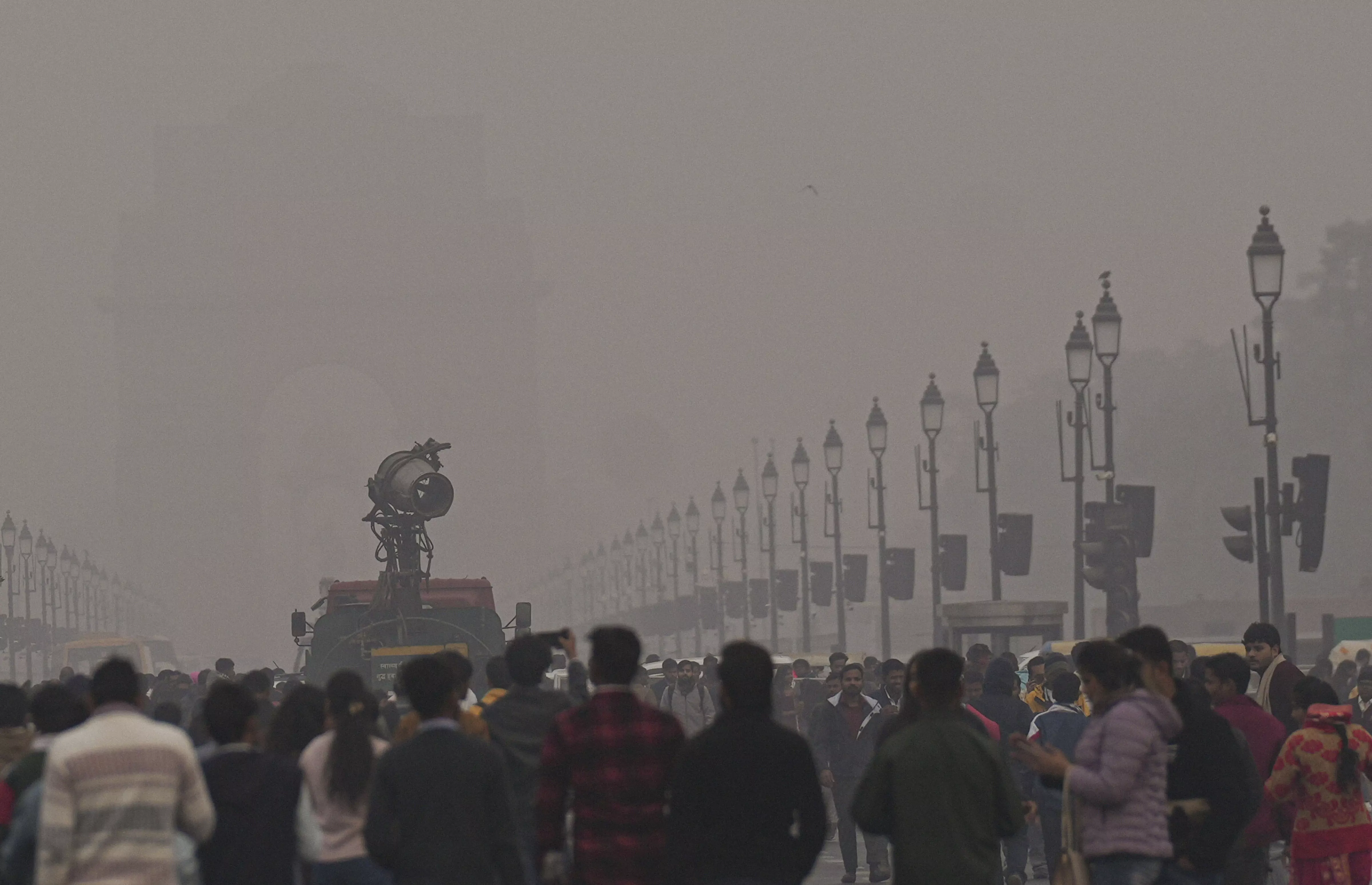 An anti-smog gun being used to curb air pollution as people visit the India Gate on New Year's Day, at Kartavya Path, in New Delhi. (PTI Photo)