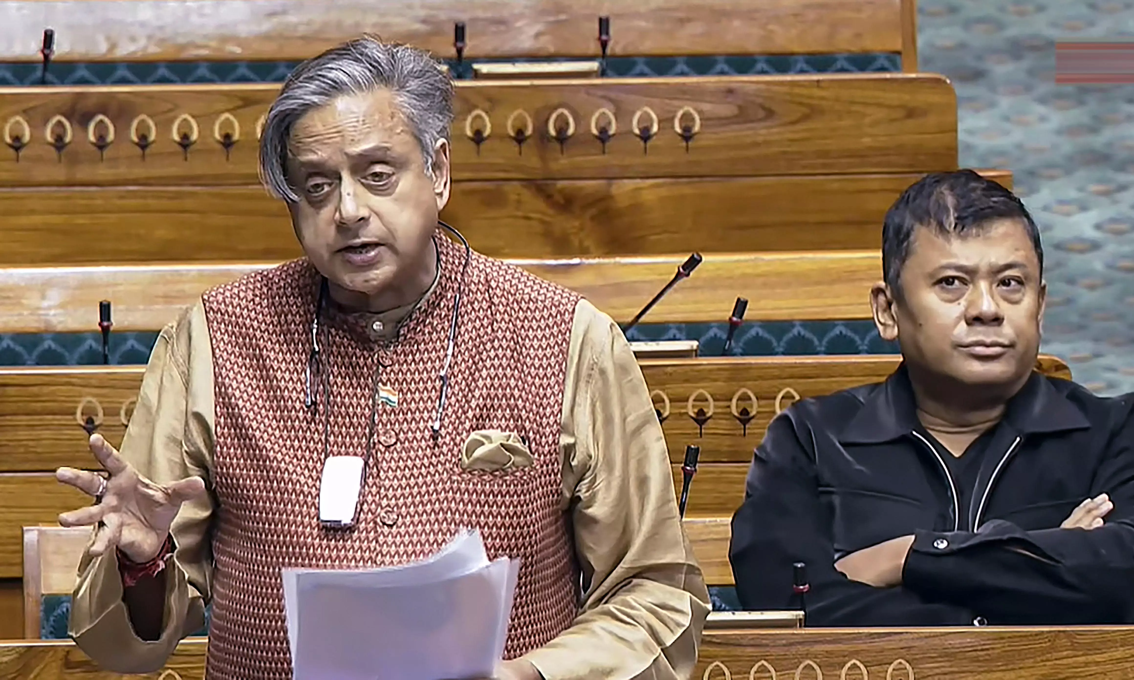 Congress MP Shashi Tharoor speaks in the Lok Sabha during the Winter session of Parliament, in New Delhi, Wednesday, Dec. 17, 2025. (Sansad TV via PTI Photo)