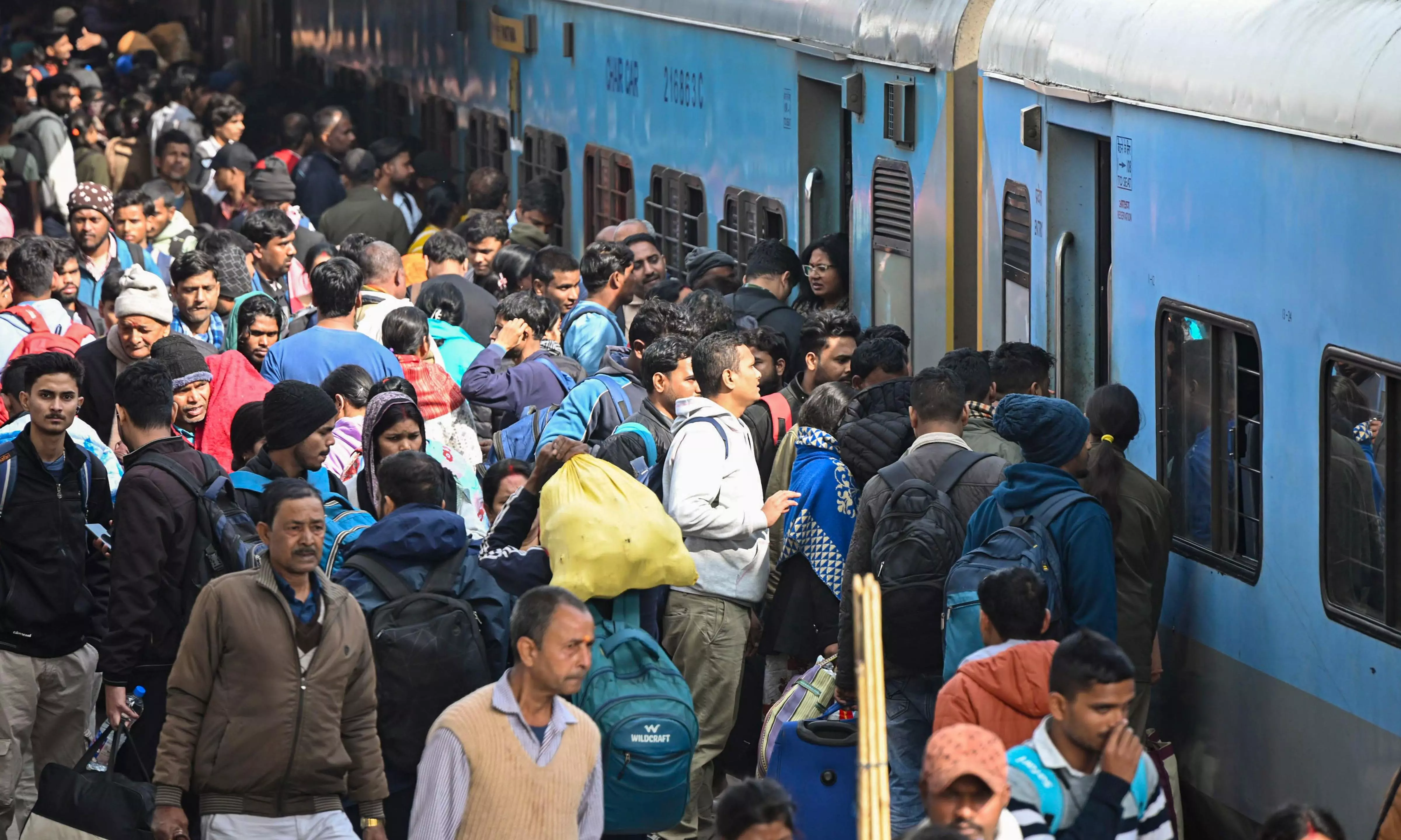 Passengers board a train, on the day of the presentation of the Union Budget 2026-27 by Union Finance Minister Nirmala Sitharaman, in Patna, Sunday, Feb. 1, 2026. (PTI Photo)