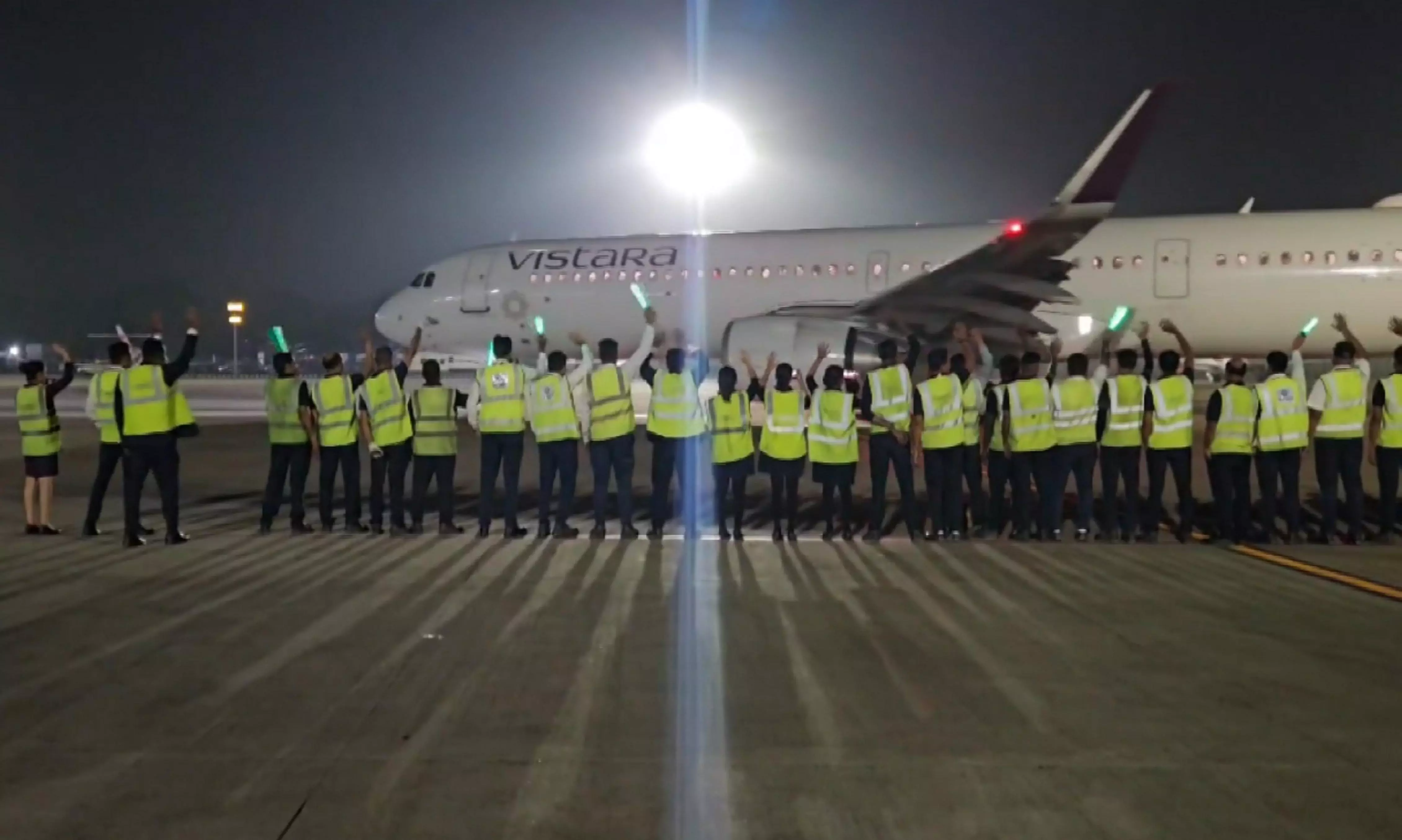 Employees wave at a Vistara plane on the last day of the airline's operation before its integration with Air India, in Ahmedabad, Monday, Nov 11, 2024. (Photo: PTI)