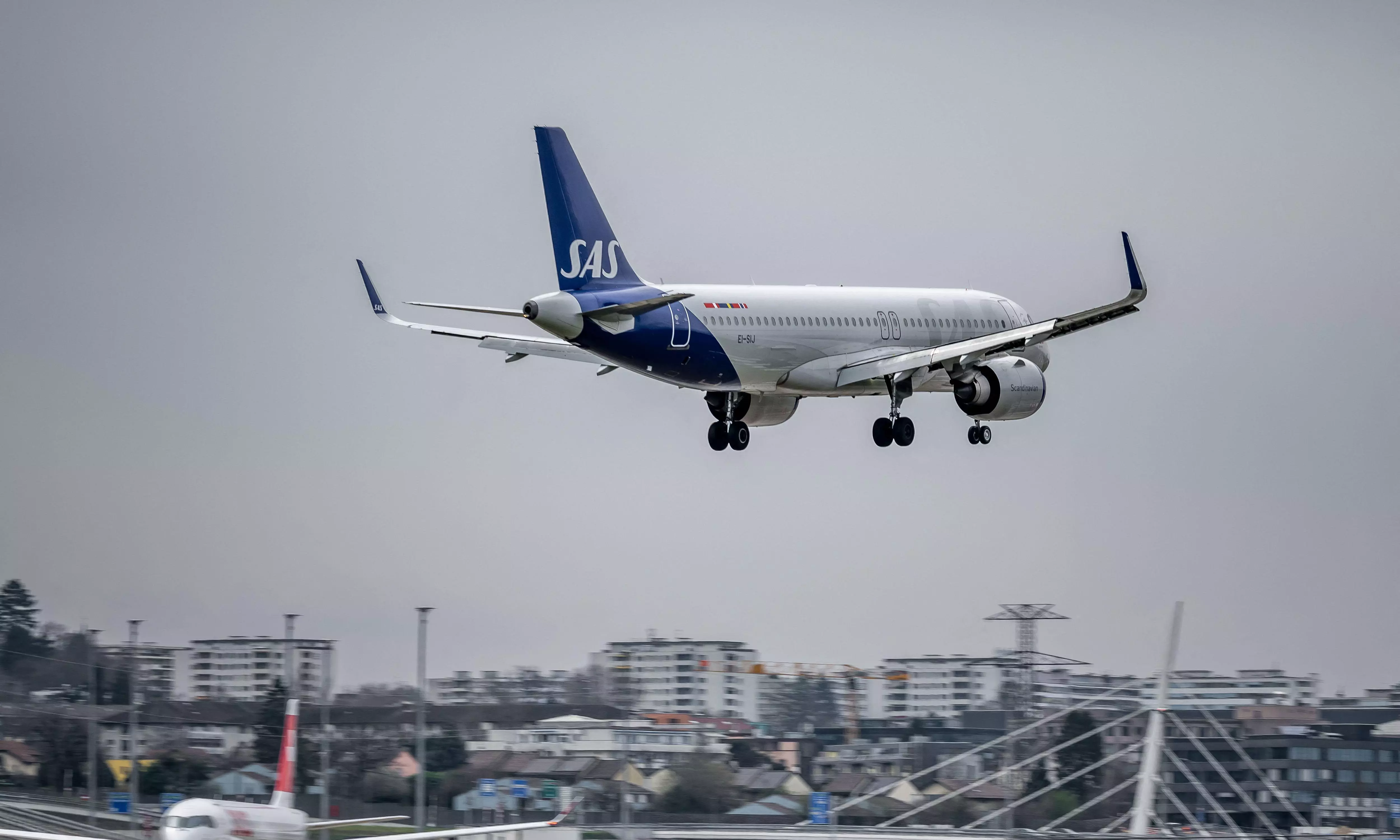 This photograph taken on March 10, 2026 shows an Airbus A320neo with registration EI-SIJ of SAS Scandinavian Airlines landing at Geneva Airport. (Photo by Fabrice COFFRINI / AFP)