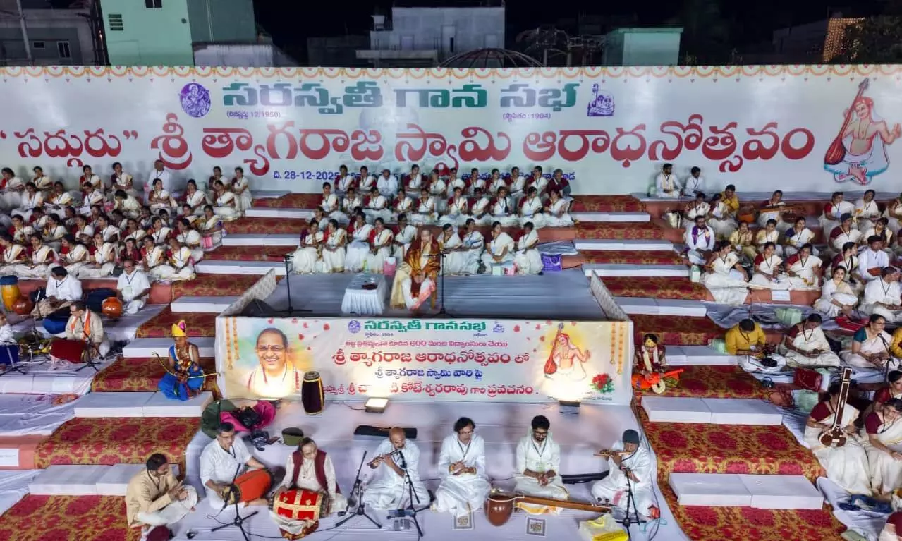 The event was organised by the Saraswati Gana Sabha, Kakinada, as part of its 122nd foundation year celebrations and marked the 178th death anniversary of saint-composer Thyagaraja. The concert, titled Thyagaraja Pancha Ratna Seva, featured renowned classical music maestros and drew hundreds of music lovers.