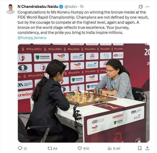 In a message on X, CM Chandrababu Naidu lauded Humpy’s sustained excellence and resilience, stating that her FIDE World Rapid bronze medal is a testament to global-level achievement and a source of inspiration for millions in India. He emphasised that her accomplishments continue to bring pride to the nation.