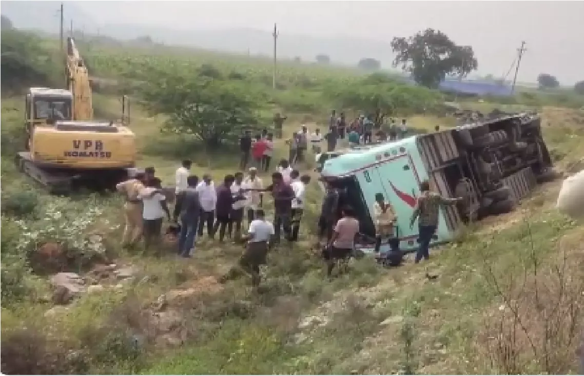 According to reports, the bus, which belonged to the Nuziveedu depot, was headed to the pilgrim town of Srisailam when the driver lost control. The vehicle veered off the highway and overturned into a roadside ditch.