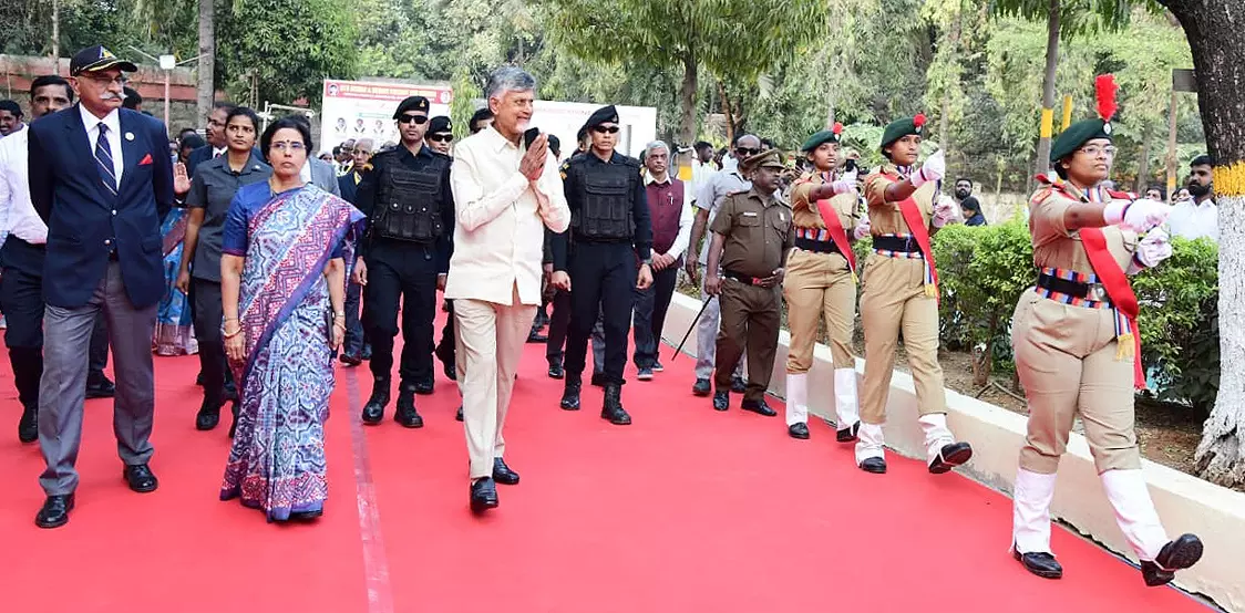 The Chief Minister toured the school, interacting with students, and took part in the celebrations along with NTR Trust managing trustee Nara Bhuvaneswari. Students from the NTR Trust educational institutions gave him a warm welcome and presented a guard of honour.