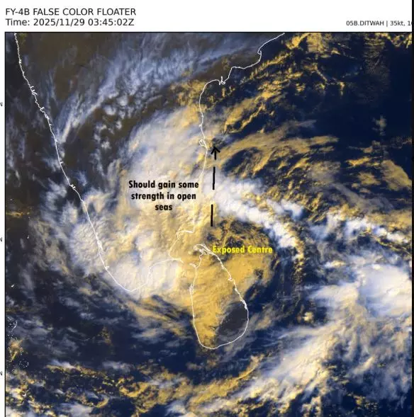 The cyclone, which formed off the Sri Lankan coast of the southwest Bay of Bengal was moving rapidly in a north-northwesterly direction and is currently centered 80 km northwest of Trincomalee in Sri Lanka and 330 km south-southeast of Puducherry, and 430 km south of Chennai.