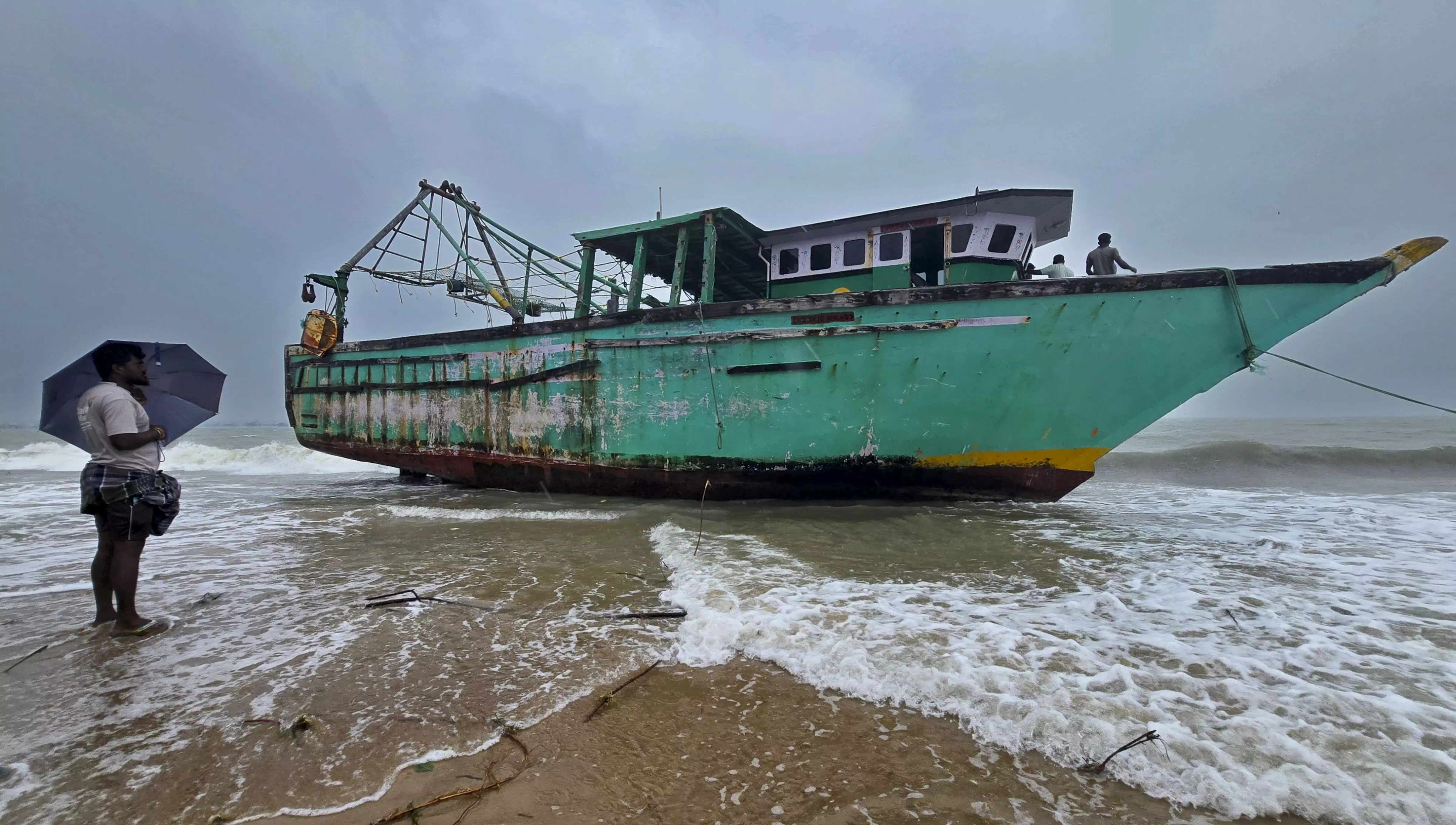 Rameswaram: A mechanised fishing boat is anchored on a beach amid gusty winds caused by the incoming Cyclone Ditwah, in Rameswaram