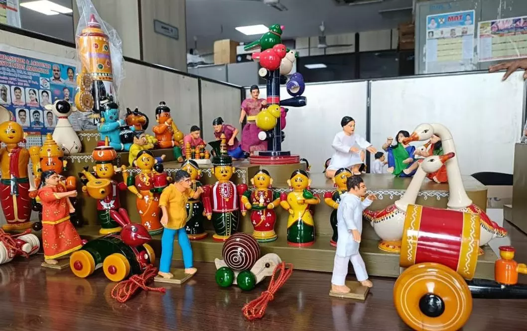 G. Santosh, the artisan crafting the toys, revealed that he uses the traditional Ankudu tree wood with lacquer finishing and natural dyes. "We create colours naturally; for instance, we mix turmeric with indigo to produce green," he explained.