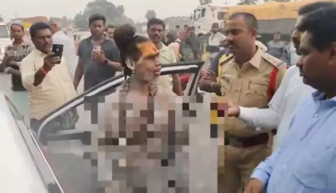 Visakhapatnam: A dramatic scene unfolded at the Nakkapalli tollgate as a female Aghori Naga Sadhu created a commotion, alleging rude behaviour by the toll-gate staff. The incident, which lasted for two hours, saw the Aghori demanding the arrest of those involved.