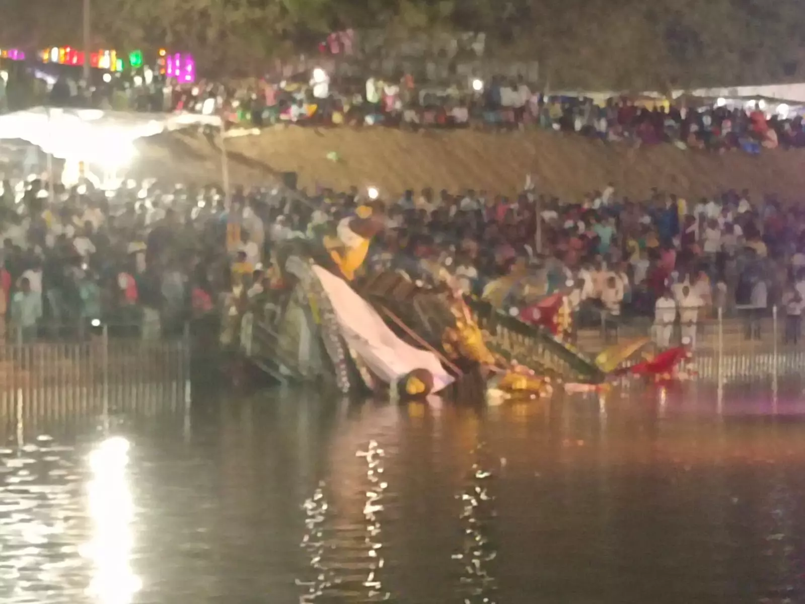 The excess load caused the float to lean to one side, and some idols and devotees slipped into the water.