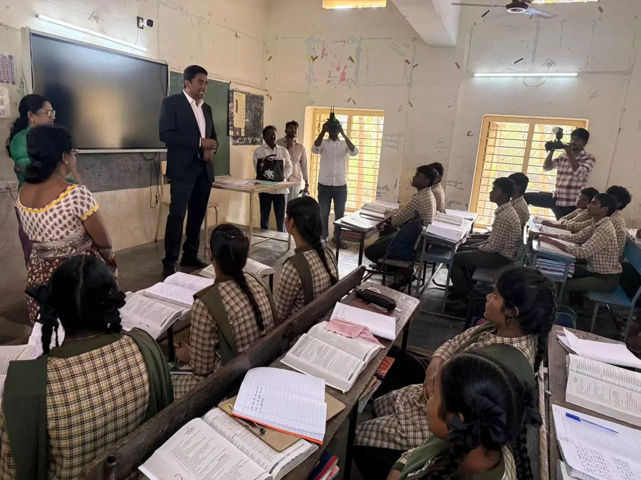 Interacting with Class X students, Lakshmisha assessed their understanding by posing questions in Mathematics, Science, and Social Studies. Expressing satisfaction with their responses, he advised students to adopt a holistic approach to learning and understand subjects thoroughly rather than studying only for examinations.